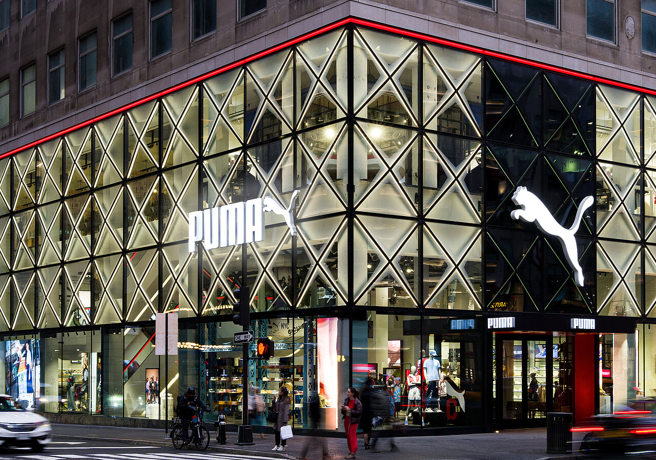 PUMA flagship store: striking star-shaped façade lighting cleverly backlit.