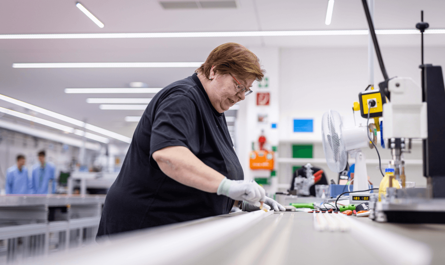 A seamless transition takes place from the assembly of the outdoor luminaires to the potting. Preparation for the potting machine requires dexterity as well as the utmost care.