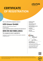 LED Linear™ was successfully audited by Intertek in September 2024 and certified according to DIN EN ISO 9001: 2015 and DIN EN ISO 14001:2015. The certifications relate to the scope of the management systems: development, production and sales of LED lamps, luminaires, components and lighting systems.