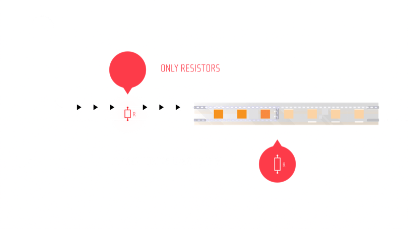 Fewer electronic parts are installed on low-quality LED strips in order to save costs. For example these tapes use only one resistor per step – a group of LEDs on the strip. Part of the incoming current flows back through the resistor and so less current is transported to the other LEDs. The LEDs behind the resistor therefore receive less current and thus lose brightness. Extrapolated to long length of an LED tape, this difference is visible and the drop in power becomes clear. With a length of 7 meters (23 ft), there is a loss of brightness of more than 25%.