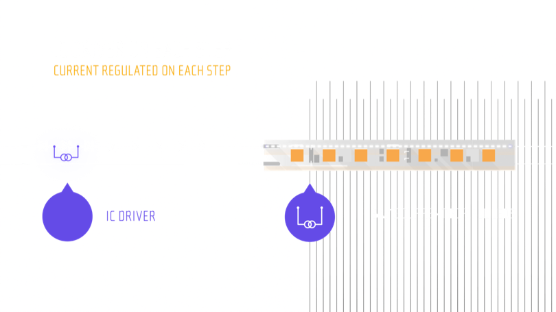 On an LED strip of higher quality, more electronic parts are installed per section. For example, a separate current regulation (IC Driver) per step can be integrated, which sets the current evenly for each step and each LED. This prevents a drop in power and the LED tape maintains the same intensity over its entire length.
