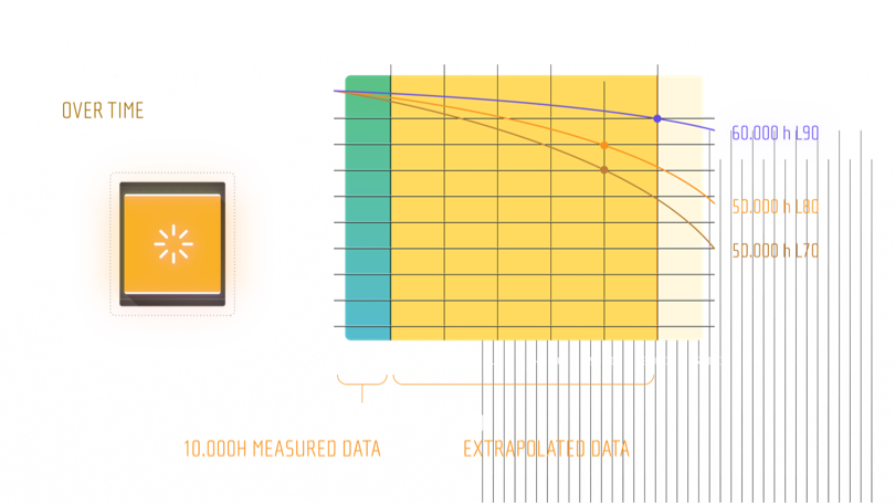 This is measured according to the IES LM80 method. This method outlines the procedures of actual light output testing of LED chips e.g. for 10.000 hours. These measurements are then extrapolated in the IES-TM21 calculation by max. 6 times related to the real measured time. This way you get the lifetime after 60.000h.