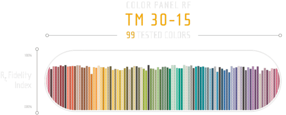The TM30-15 report is a novel method to measure color rendering. It also takes the sun as a reference value of 100. 99 colors are tested with this method instead of 14, thus an expanded spectrum can be analyzed. The average of all 99 colors results in the Fidelity Index Rf. In this example, the difference can be seen particularly well in the red/orange and pink skin tones. Another component of the TM30-15 method is the gamut index Rg which measures the saturation of colors within the same color spectrum. The ideal value for Rg is 100, but the measured value can be both below and above 100. A perfect light source would have a value of 100 for Rg and Rf.