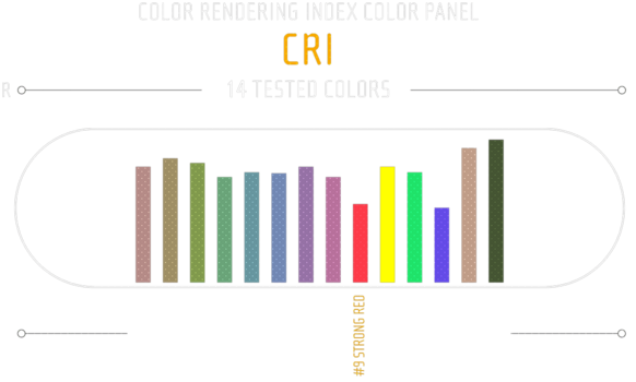 With this method, the color rendering of 14 colors is tested according to DIN 6169. The color rendering of the sun (100%) serves as a reference value. Particular attention is paid to R9 – saturated red color. R9 is an important metric for artificial lighting as most LEDs lack of the red compared to reference light source like the sun. A higher R9 ensures that the perception of the light is more natural than synthetic. The higher the value, the better the color rendering. The higher the value the more appealing the red apple looks.