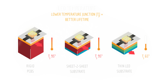 Some materials dissipate heat away from the LED chip better than others. Many manufacturers use versions of PCB plastics as substrates for their LED modules. Plastics, among others, has a poor thermal conductivity, which means that heat accumulates and the LEDs heat up fast.