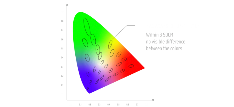 LEDs have different colors due to production tolerances. It is important to sort them into so-called “bins” to make sure. This binning structure follows the MacAdams ellipse metrics which guarantees no visible differences if within 3 step MacAdams (SDCM3). The lower the number, the tighter the binning, and thus the higher the value of an LED chip. To obtain a color impression that is as homogeneous as possible, only LEDs of the same binning should be used.