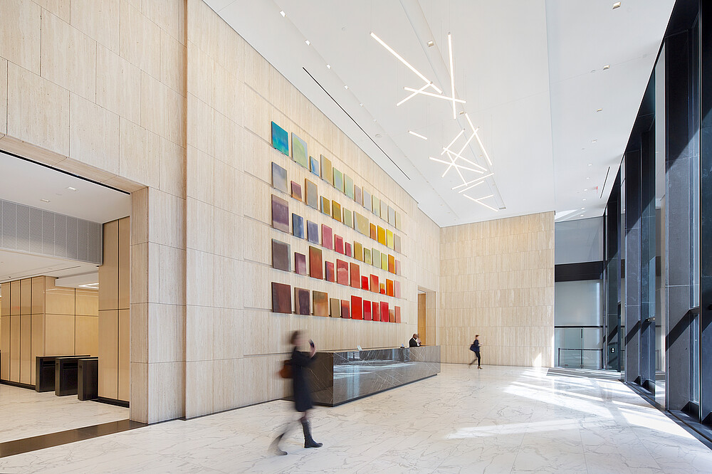 Vornado has recently completed a major capital improvement program including a modernized lobby, destination dispatch elevators and upgraded mechanical systems to transform this building into a state-of the-art, Class A asset. The lobby is illuminated with an extraordinary lighting concept and is a real eye-catcher. The lighting designers opted for the elegant pendant luminaire XOOTUBE™ as an oversized mobile.