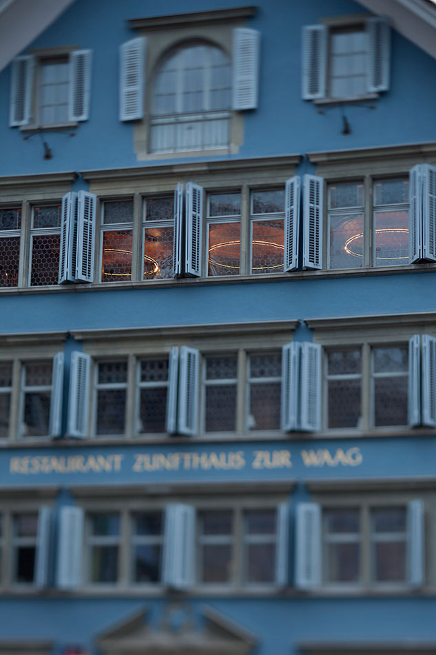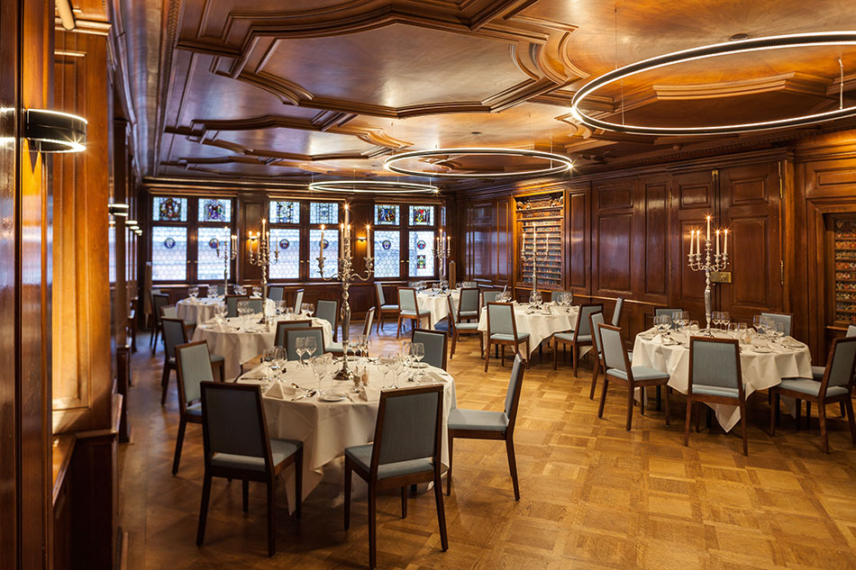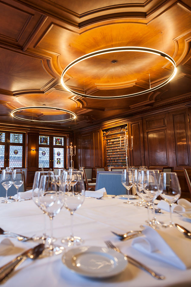 LIGHT ON developed ceiling lighting in the form of three large suspended ceiling rings each with two meters diameter to light up the historical fully panelled Zunftsaal hall in the Zunfthaus zur Waag. Diffused LED strips inserted at the top in the rings light up the beautiful wooden ceiling homogeneously. The LED strips shining downwards have the job of bringing high brilliance and lots of light into the room. To match this LIGHT ON developed wall lights and cleverly highlighted the window niches using a light installed almost invisibly into the wooden panelling. Thanks to the high color rendering index of the LED strips and a light control system with which all the lights can be controlled individually, the ideal lighting mood can be created for any situation, be it the restaurant business, a seminar, wedding or reception.