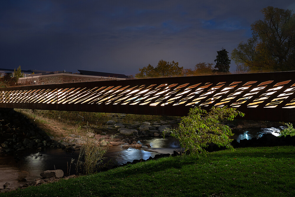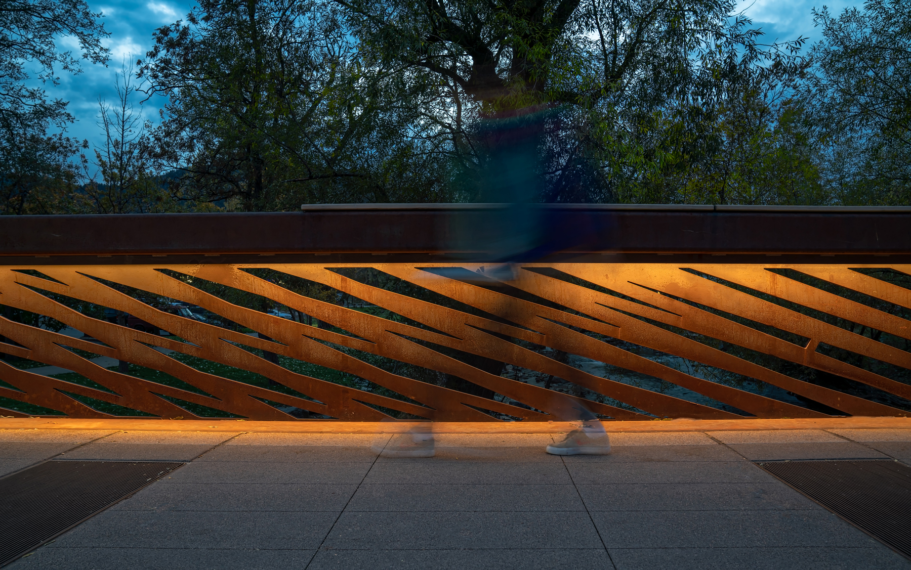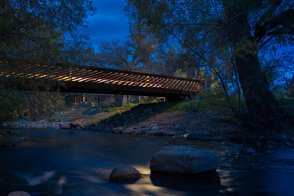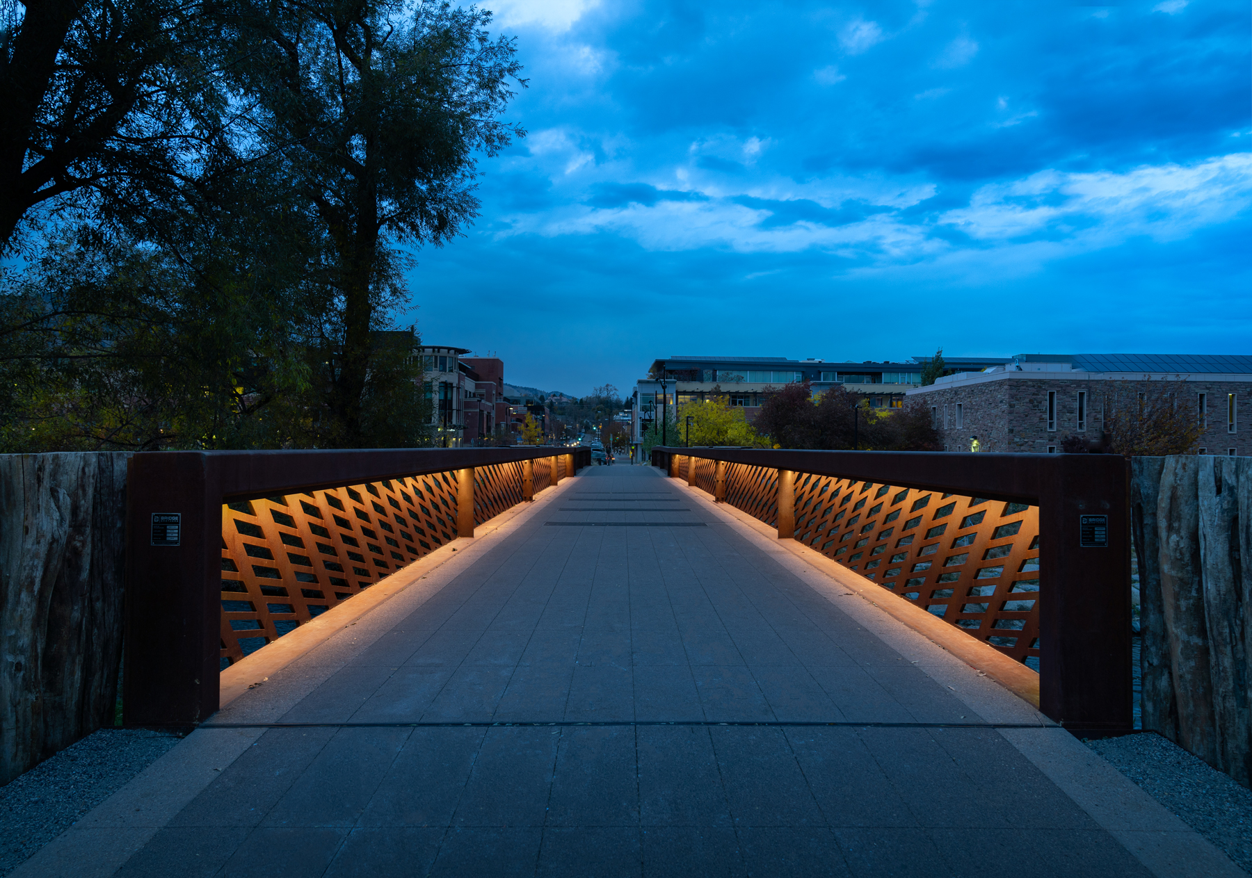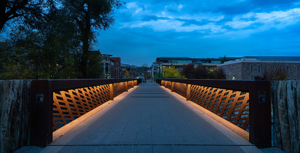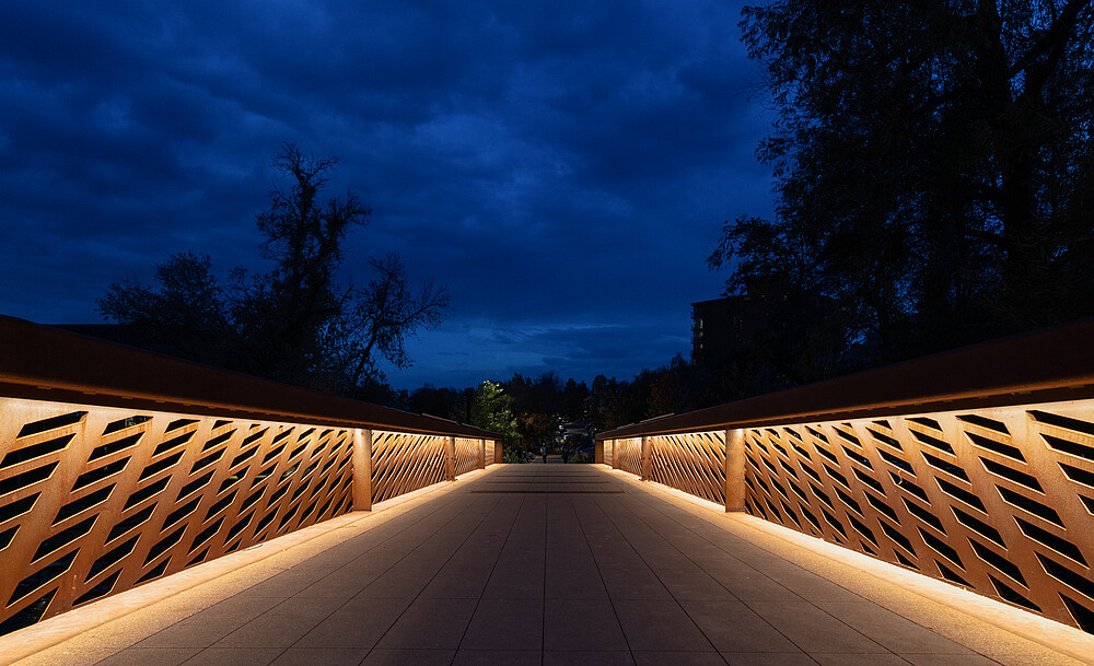 This pedestrian bridge in Boulder, Colorado, was illuminated with the outdoor luminaire KALYPSO IP67. By mounting it below the railing, the light shines specifically downwards onto the walkway and gives the necessary orientation in the evening hours.