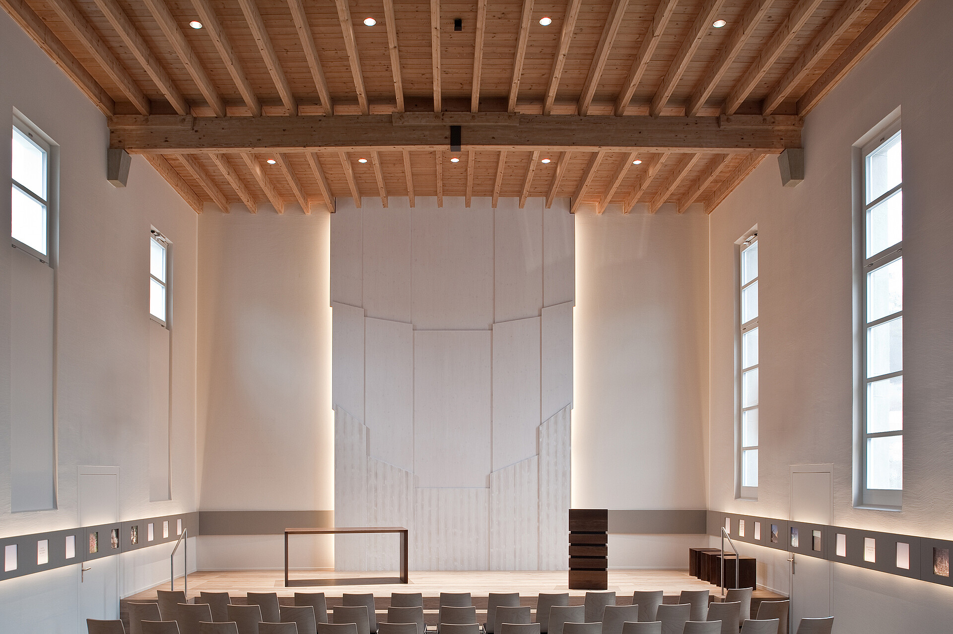 LIGHT ON implemented as sole contractor the lighting concept for the newly renovated Reform Church Kollbrunn. With a sensitive and very atmospheric lighting, LIGHT ON underscores the architect’s airy and open design. The central element of the room is the altar wall that is highlighted as a sculpted-light element and which gives the church interior its clear alignment and allows both light and depth to take effect.