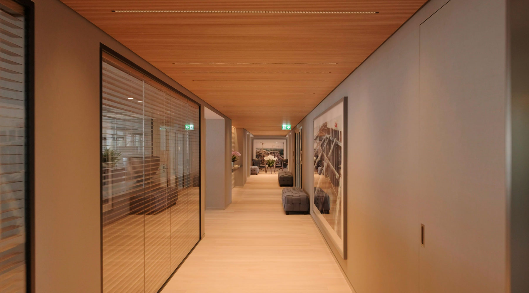 In this Swiss commercial building, an intelligent lighting solution was created by using ULTIMA-S IP40. ULTIMA is ideal for integrating lighting into the architecture. With its minimalist design, the luminaire blends into the wooden ceiling, disappearing from view.
