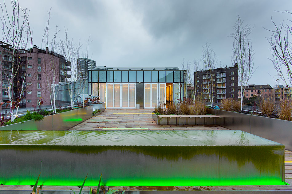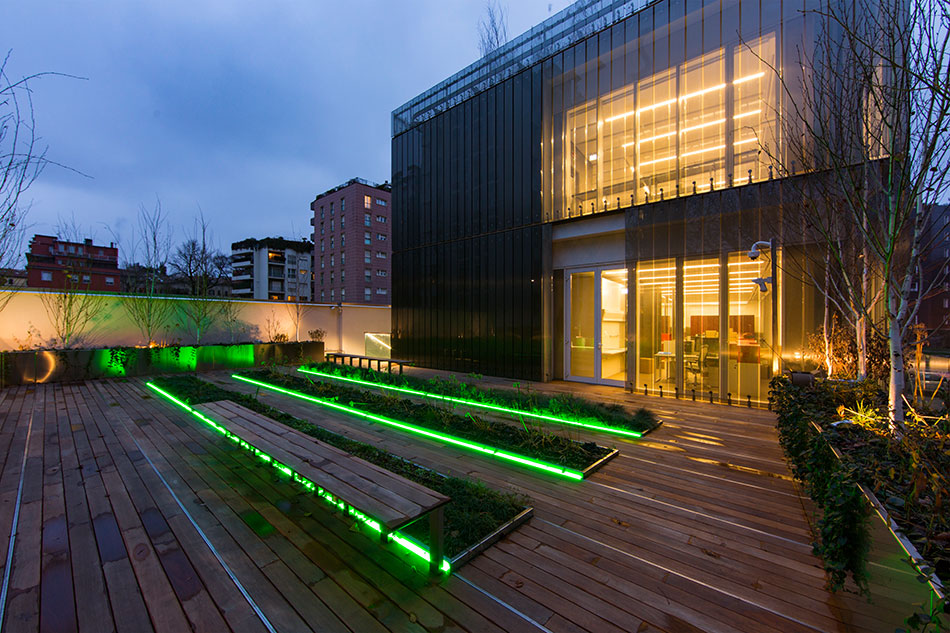 The modern headquarters in Milan has been equipped with various lighting solutions from LED Linear™. Inside the building, the ceilings and contours have been illuminated with ADONIS to create continuous light lines. ADONIS impresses with light intensity and an absolutely homogeneous light emission surface, providing a pleasant, diffused light. Outside the building, there are flower beds and ponds, lit with VarioLED™ Flex VENUS RGB. At dusk the light line sets appealing, colorful accents and transforms the outdoor complex into an attractive location. It combines design with high durability and is IP67 protected against water, salt water and UV radiation.