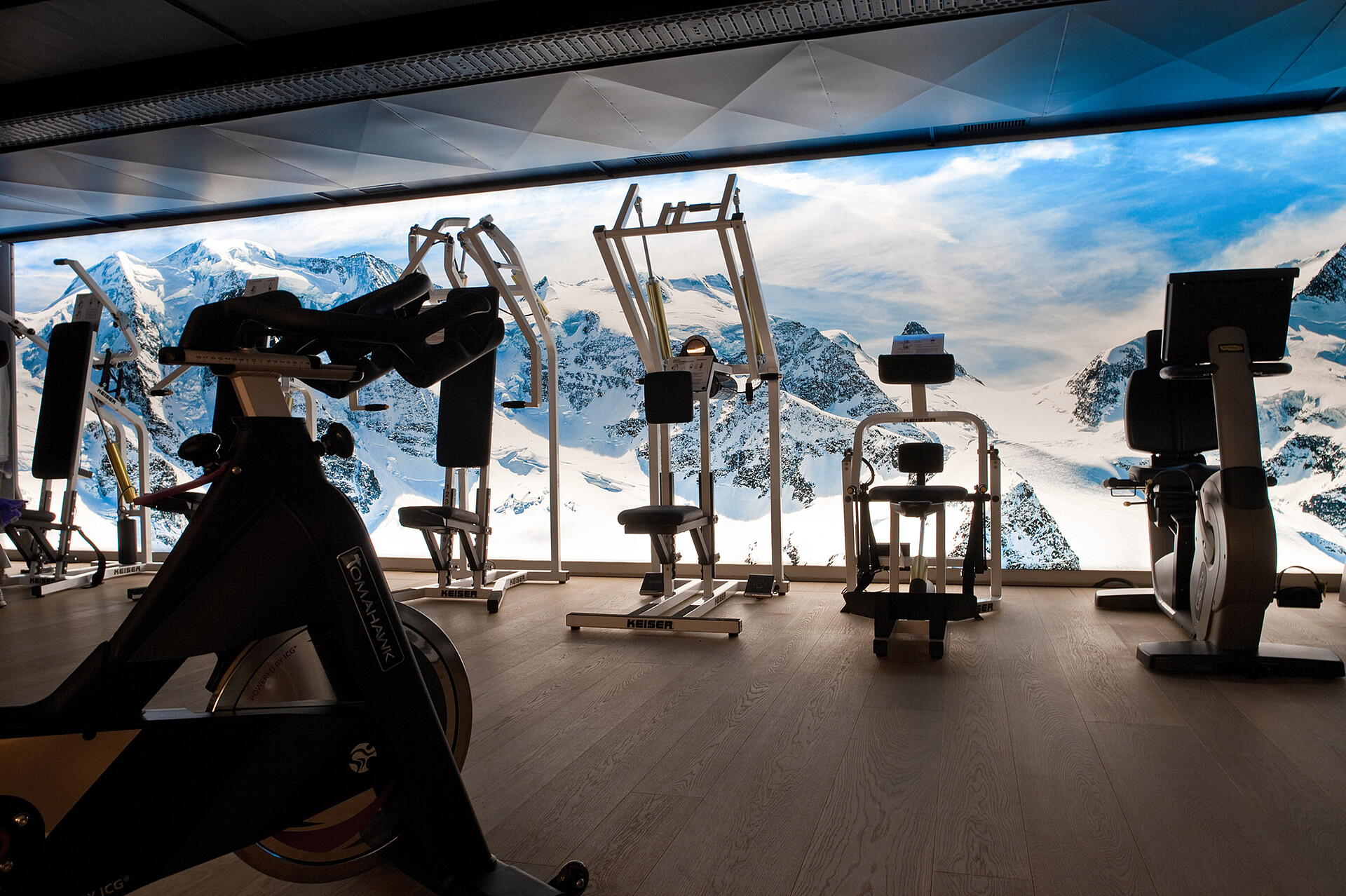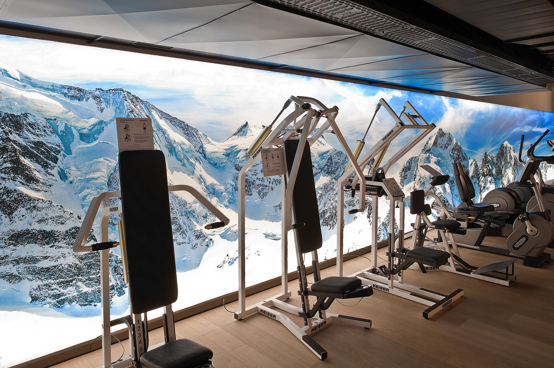 When redesigning the fitness area at the 4-star Crystal Hotel in St. Moritz, LIGHT ON created a completely new spatial dimension through an oversized light image. Inspired by another project, the architect wanted for the space the illusion of a sweeping view of a mountainous landscape: the very narrow, elongated and low space was to be illuminated over the entire length with a single image artwork.