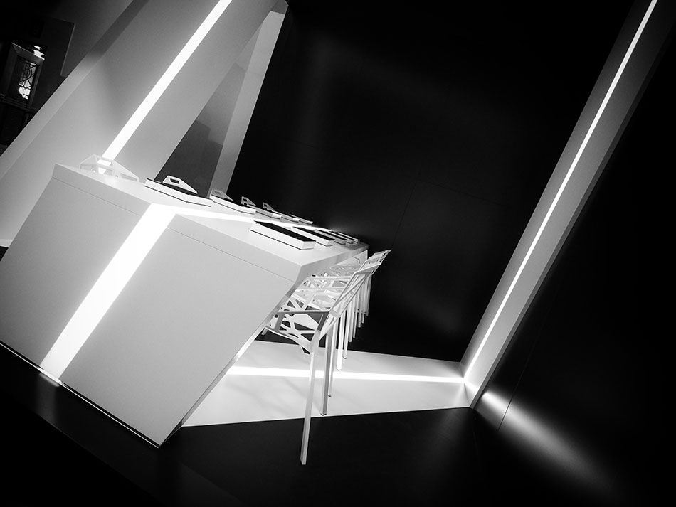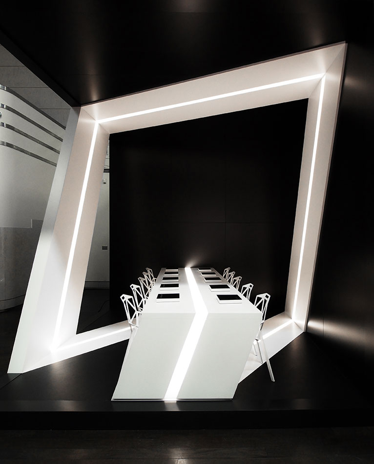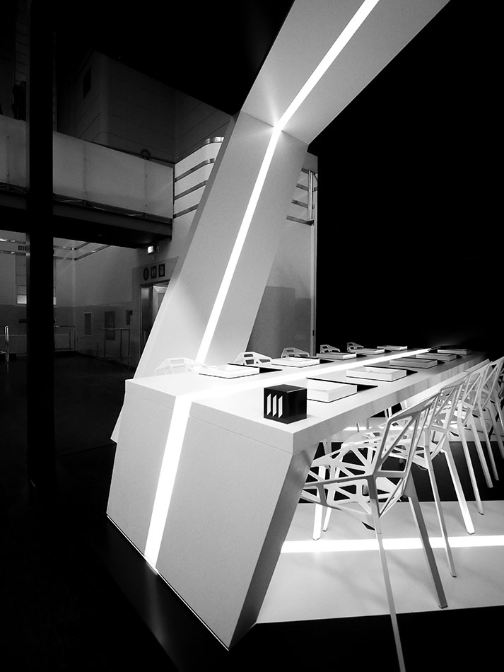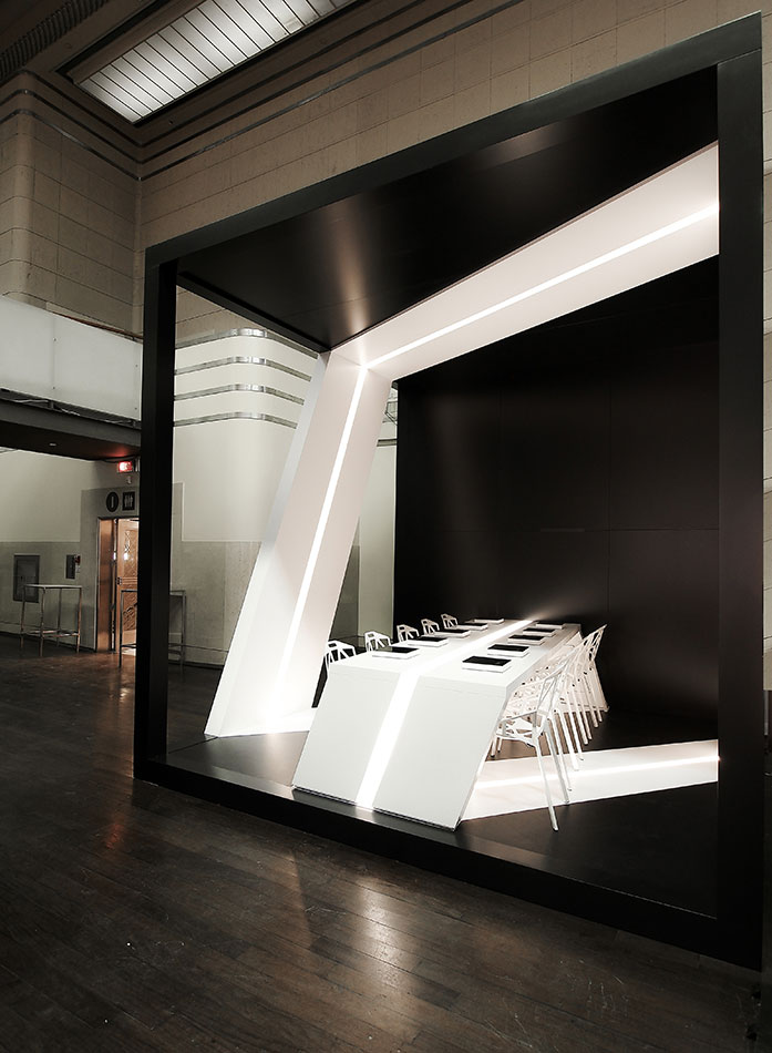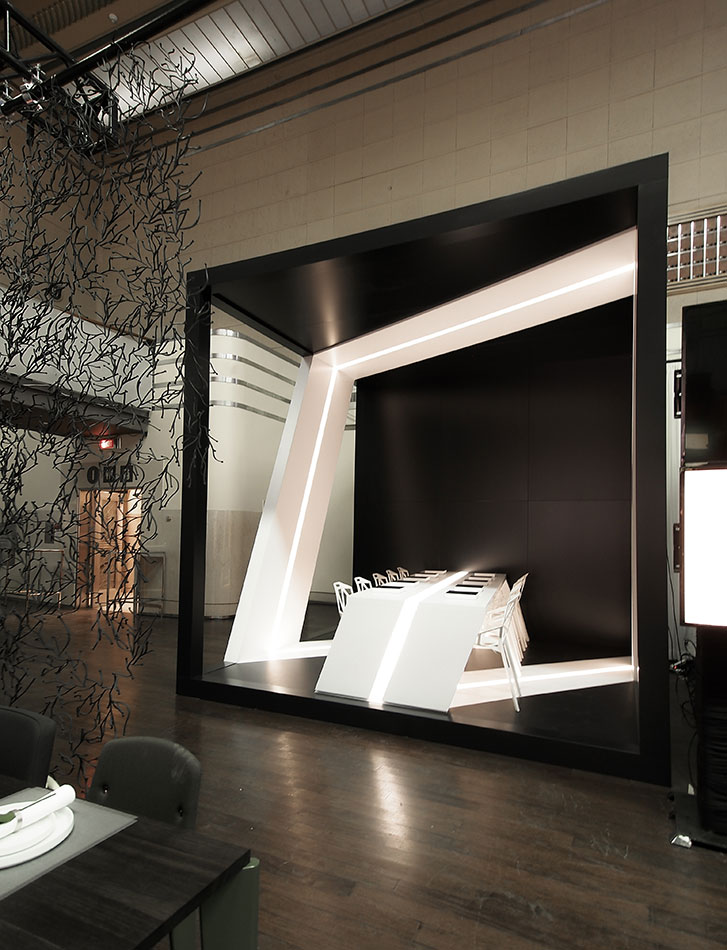 “Our design inspiration came from a desire to explore the concept of a Möbius strip that would wrap the entire volume and also serve as the dining surface. Our intent was to make the Möbius strip the focus of the space and to make an enclosure that would dematerialize. We wanted a dramatic contrast between void and mass and we hope you like the result. “ - Michelle Park, Project Manager.