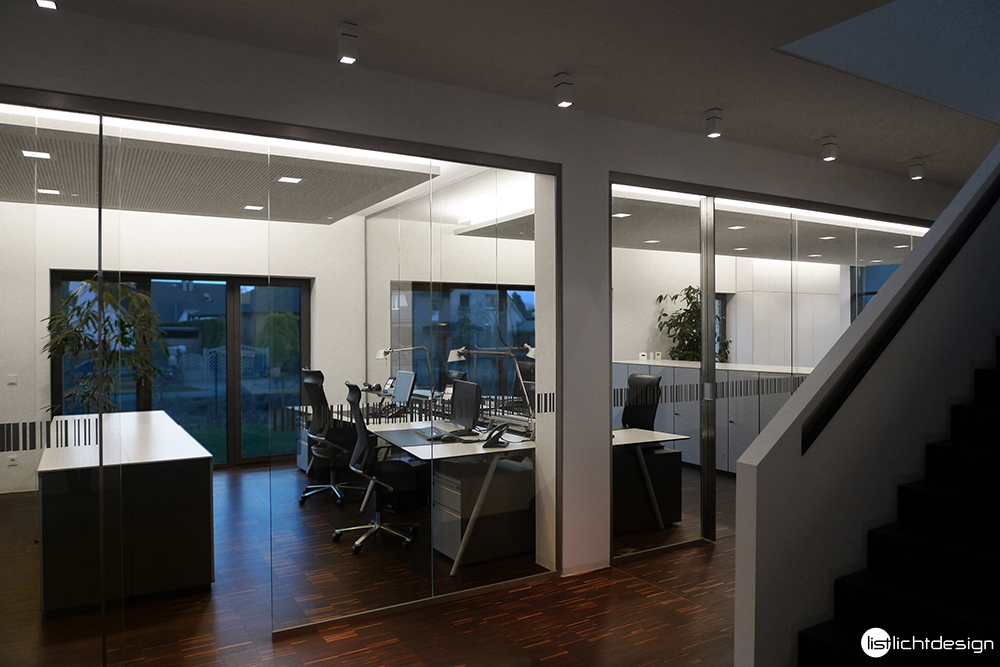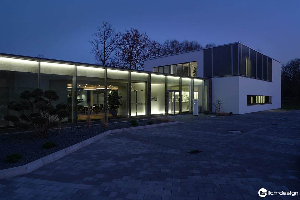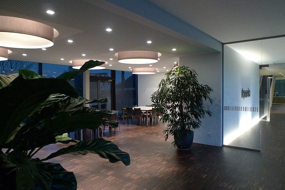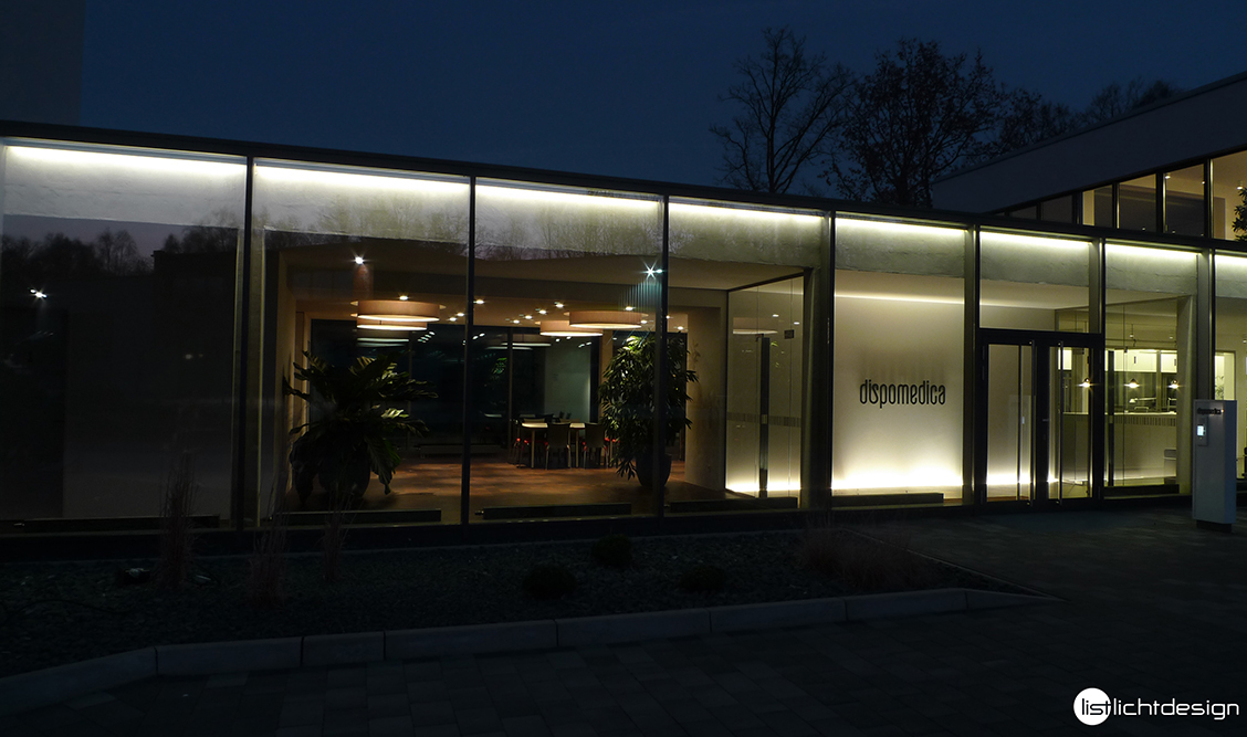 New corporate headquarters with offices, hallways, conference rooms, cafeteria and reception. Window skylight / walkway with ATON Plus W830, floor line porch / uplight lettering Dispomedica with APOLLO W830, cove lighting, office, indirect lighting with SOL W830.