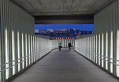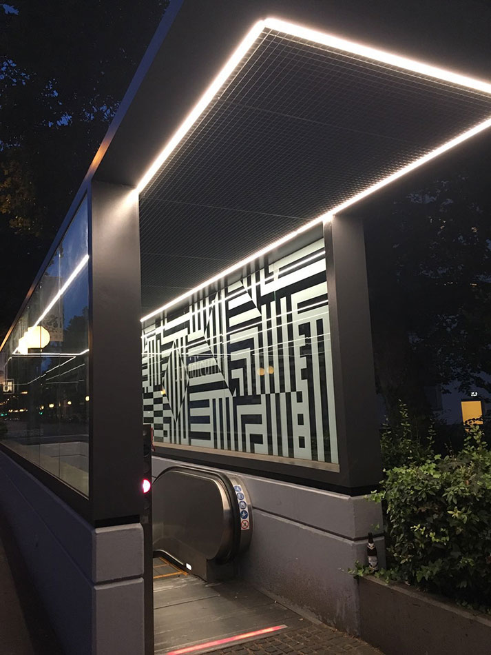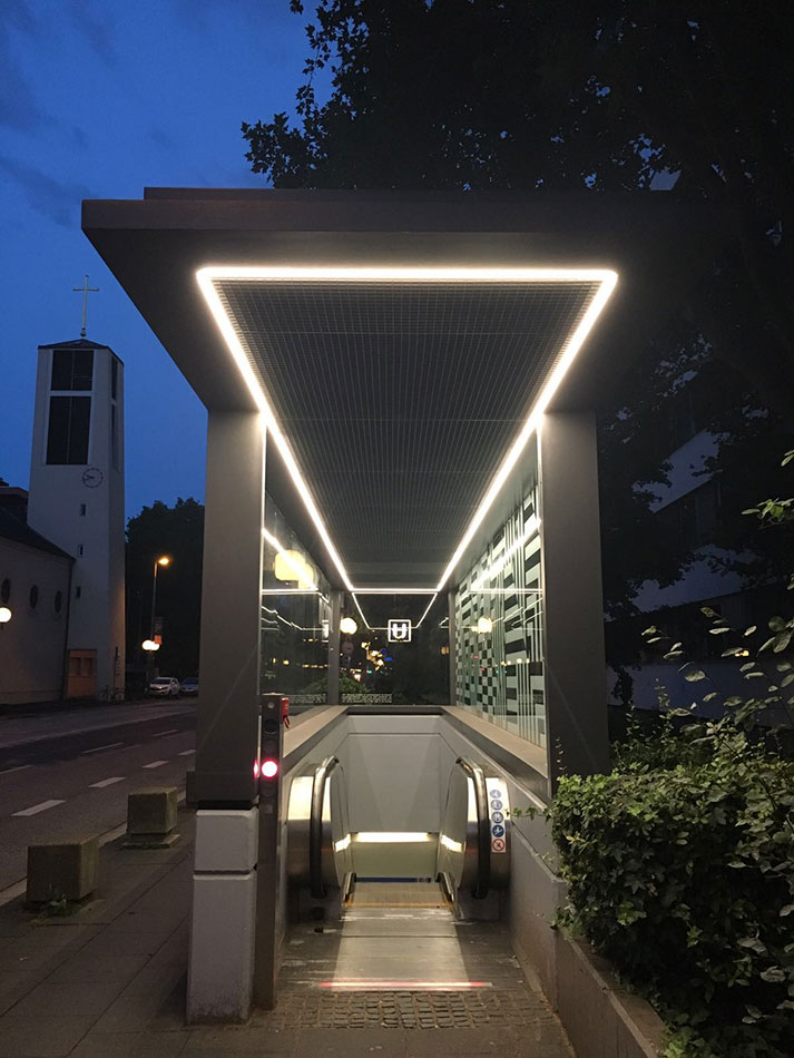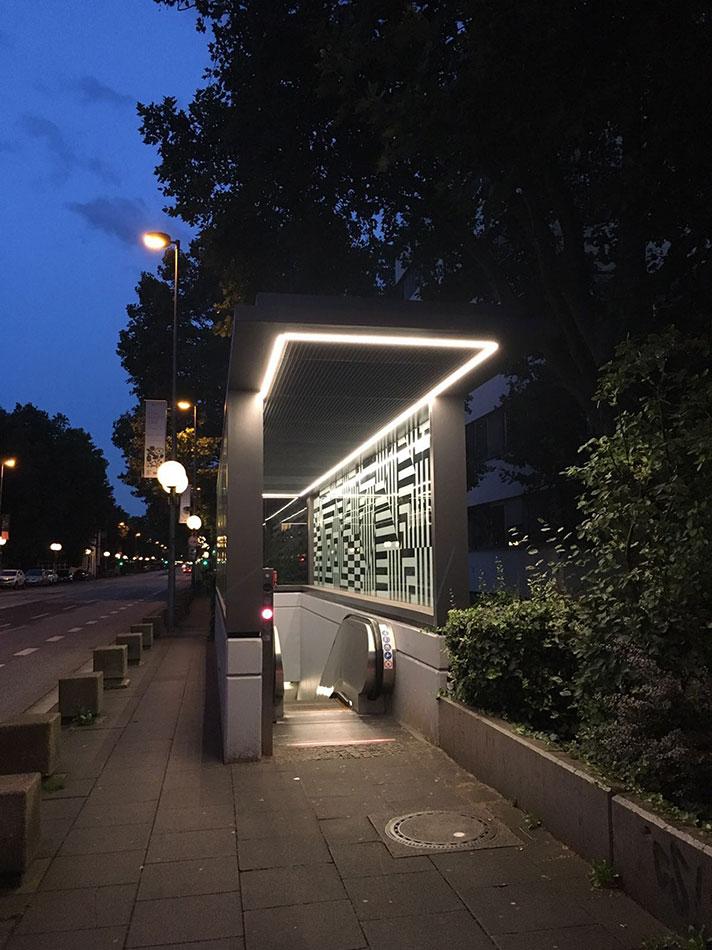 At the stop of the subway line B9 before the University of Jurisprudence (Law Faculty) in Bonn, the escalator has been extended by a roofing. It was also effectively illuminated with a light band from LED Linear. The stop is a good example of the changing needs of people in urban areas. Life during the night becomes more important and people want to be safely guided through the night. The illumination in the roof, for which the opal encapsulated VarioLED™ Flex PHOBOS was chosen, makes this possible and the area is lit homogeneously and appealing. Even more: through the interplay of light and artfully decorated glass the stop becomes a nightly highlight. The illuminated stop also supports the orientation of the passers-by and gives them a feeling of safety.