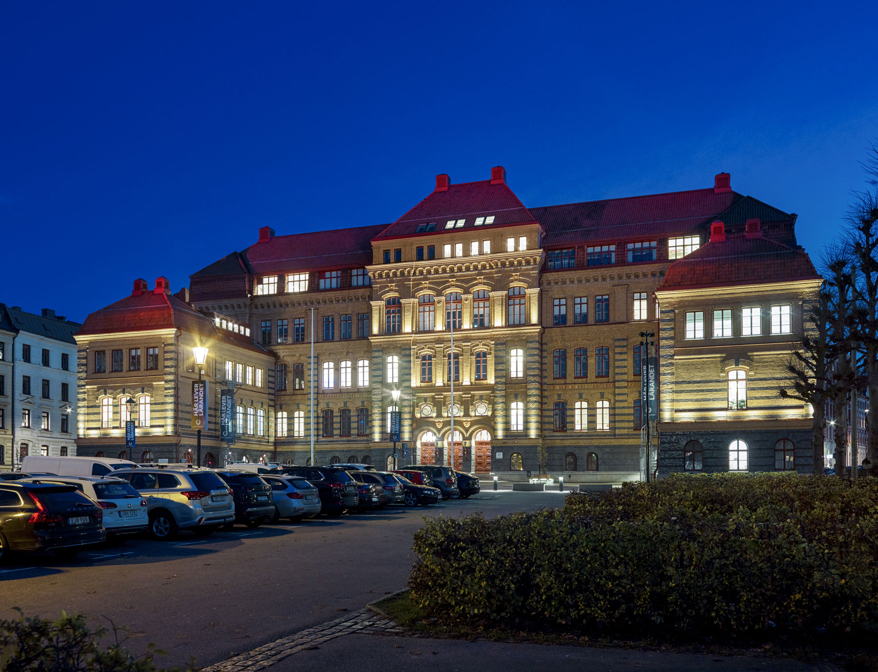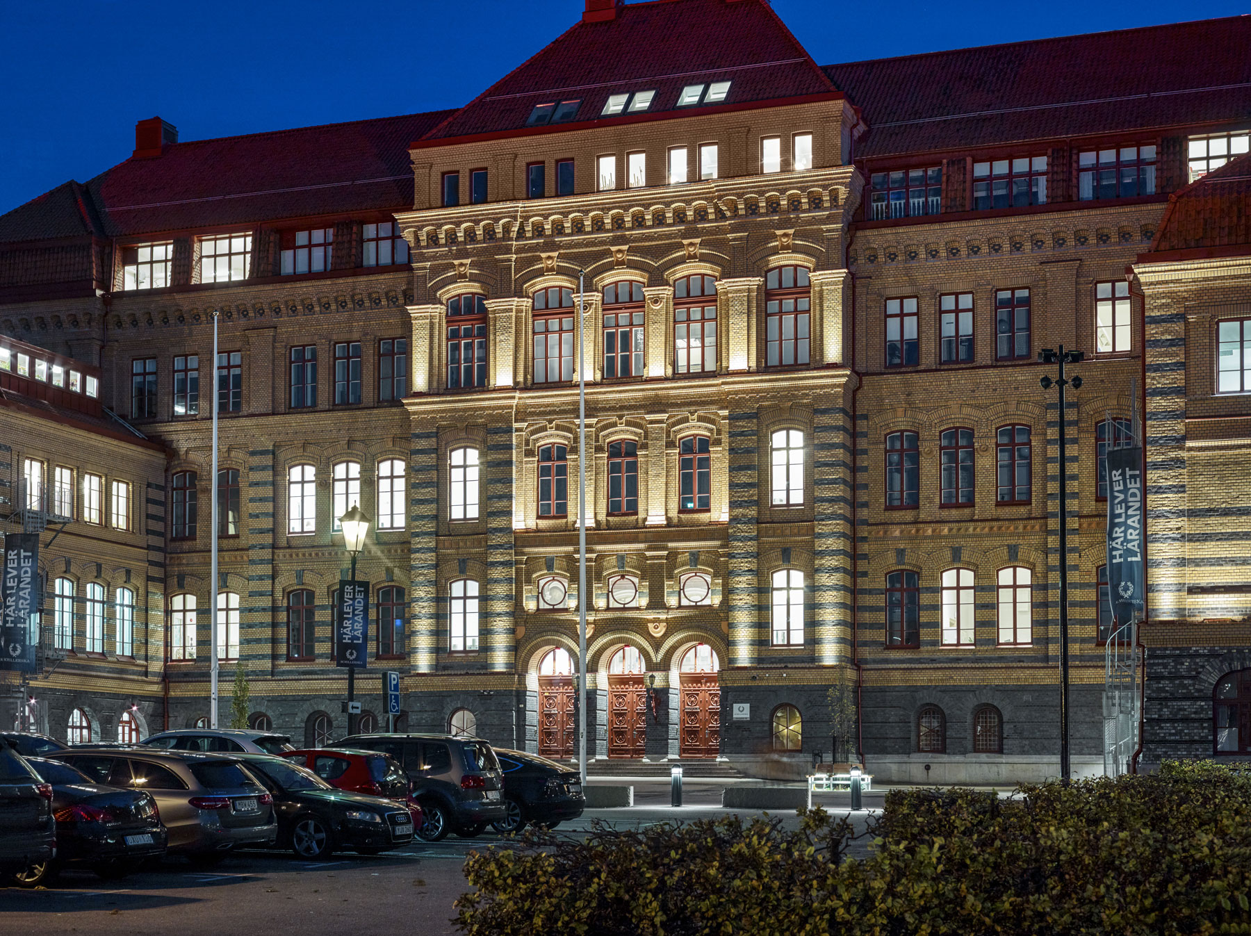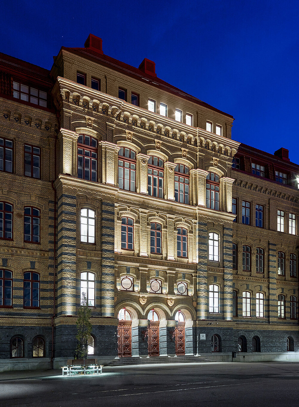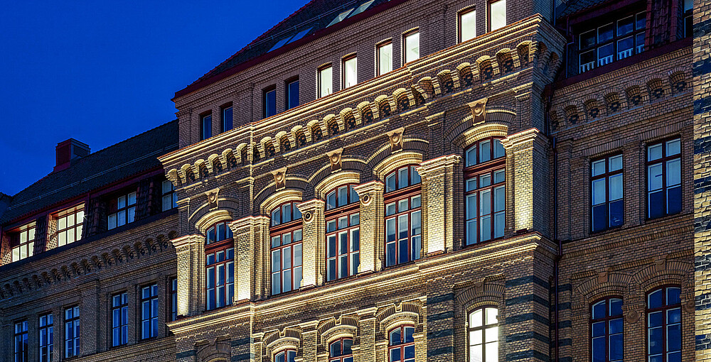 Schillerska high-school in the center of Gothenburg is a beautiful historic building from 1887, originally designed by architect Hans Hedlund. In summer 2019, the high school was given a facelift with new façade lighting. The front is equipped with 10° grazer from the ADONIS ARCHITECTURAL IP67 luminaire range with 2700 Kelvin, which illuminates the magnificent façade with all its details. The window sills are illuminated by VarioLED™ HYDRA LD10 3300 K IP67 luminaires, whose brackets are color-matched to the burgundy windows.
