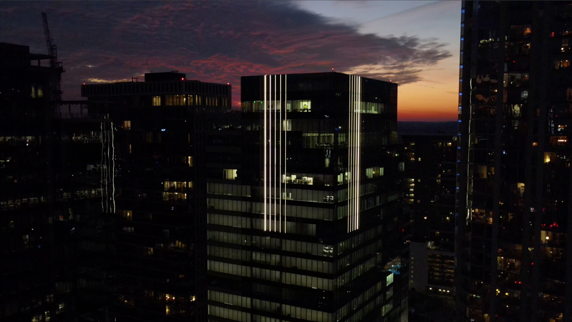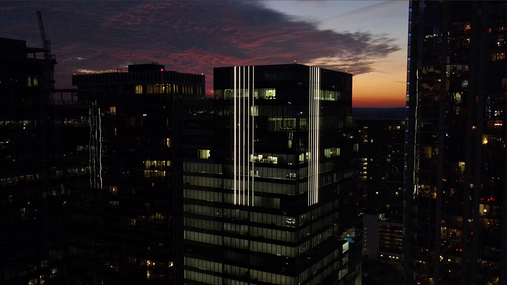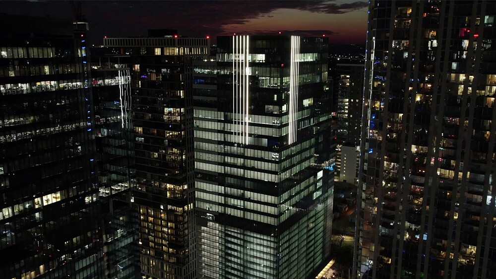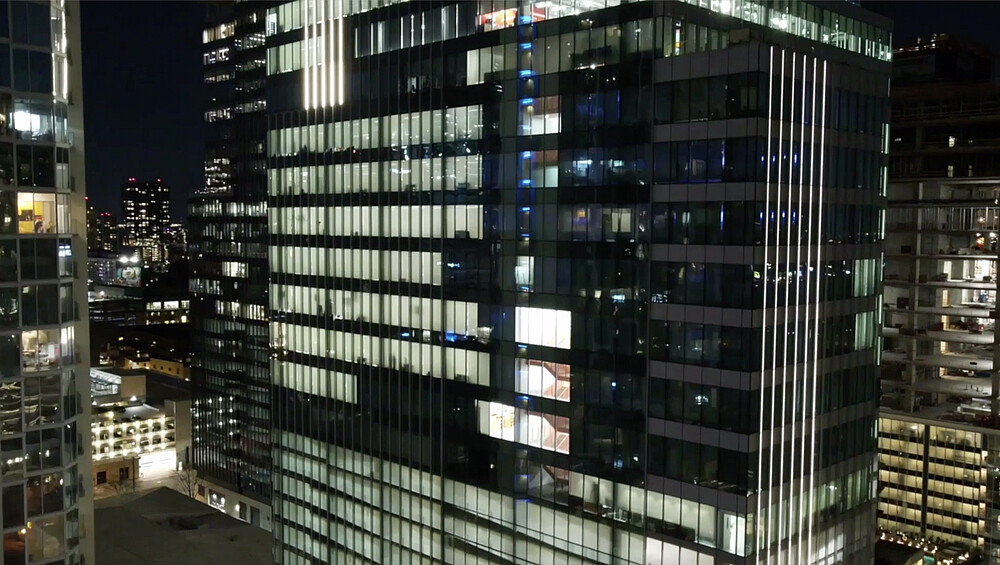 This task proposed to the design team was to light the exterior façade of the client’s commercial office tower in a way that was completely different than the standard crown or cornice lighting, or the LED “outlining” of a building edges. To make matters more challenging was that the tower’s architectural design was that of a smooth glass curtainwall façade; and the building was also attempting LEED certification. The solution was to create a reinterpretation of classical “uplighting” with a gradient of light that “fades to black”. To achieve this effect, the design team chose to embed DMX controlled LED linear lighting directly into the curtainwall of the building. The placement of the narrow vertical lines of light were positioned to match the changes in the “texture” of the expression of the window-wall mullions. The lighting is not visible from the interior of the tower.