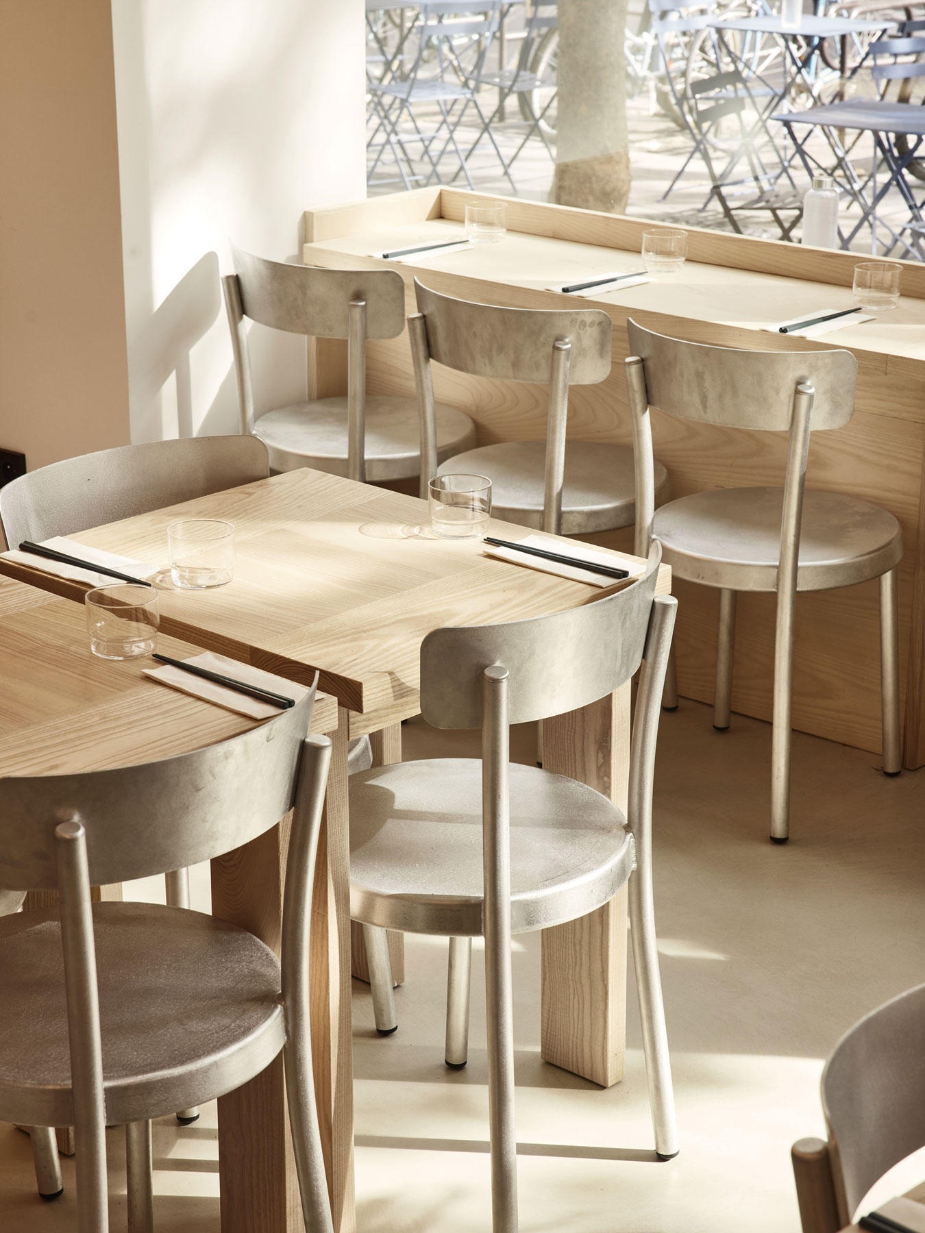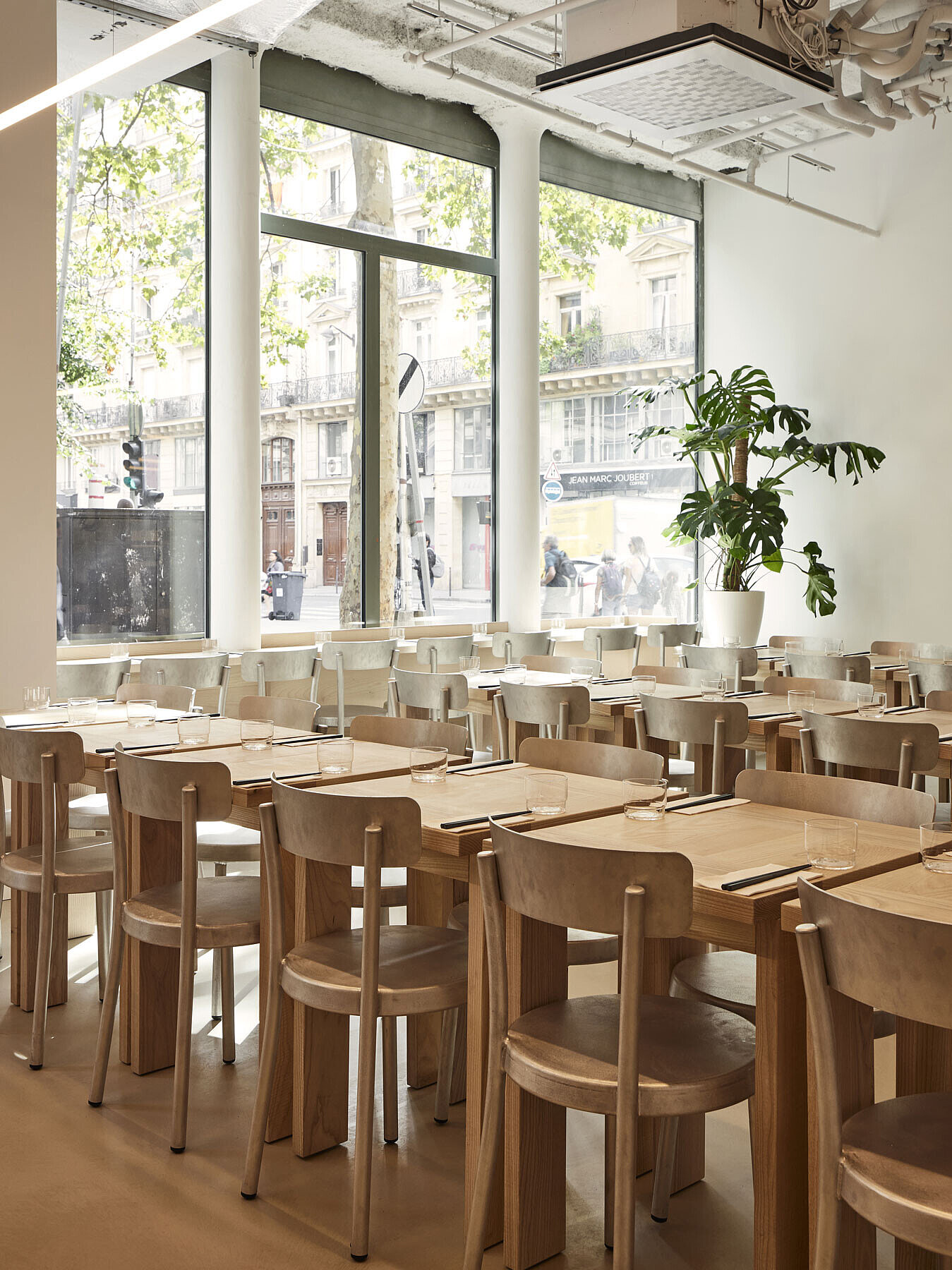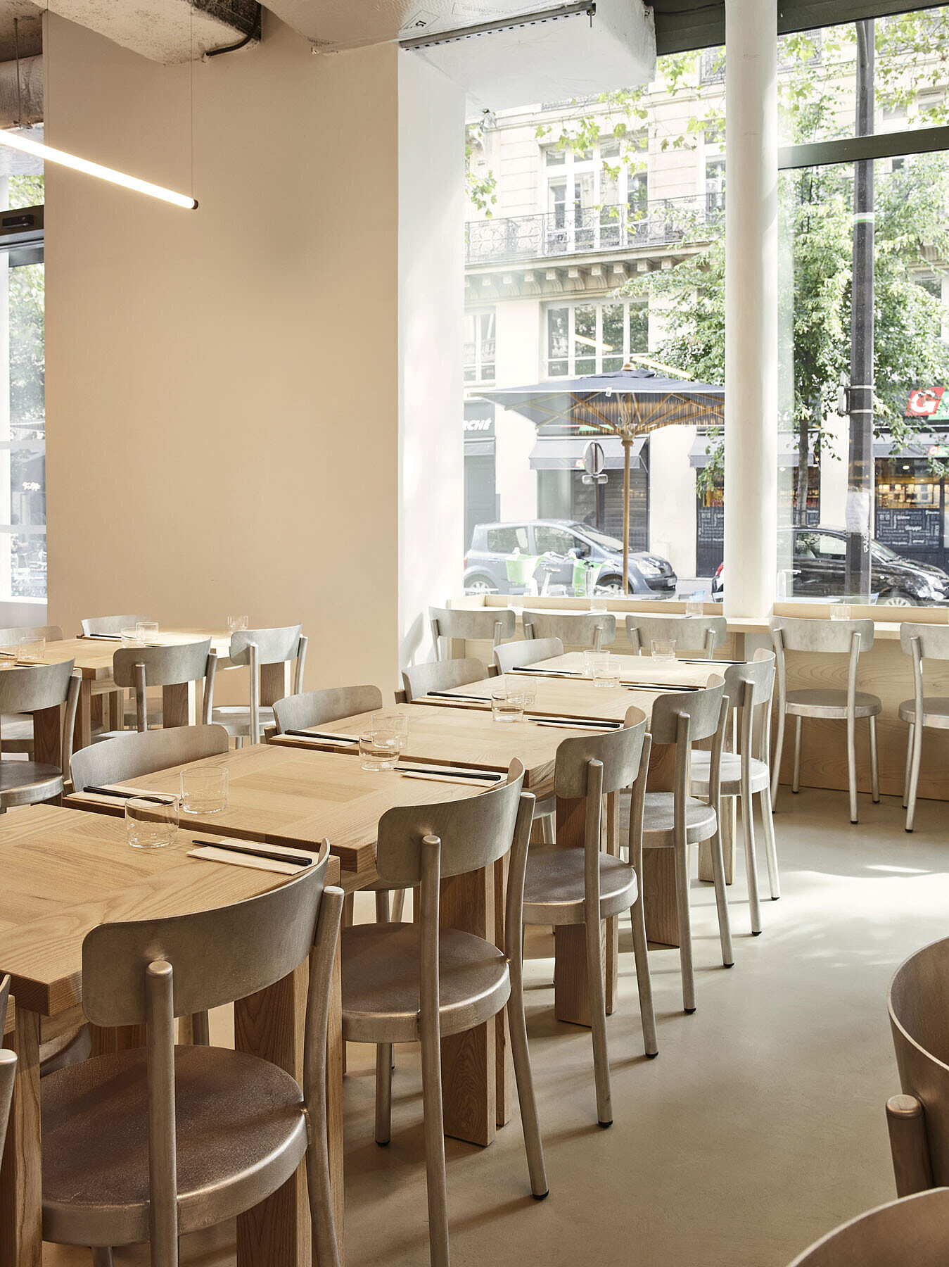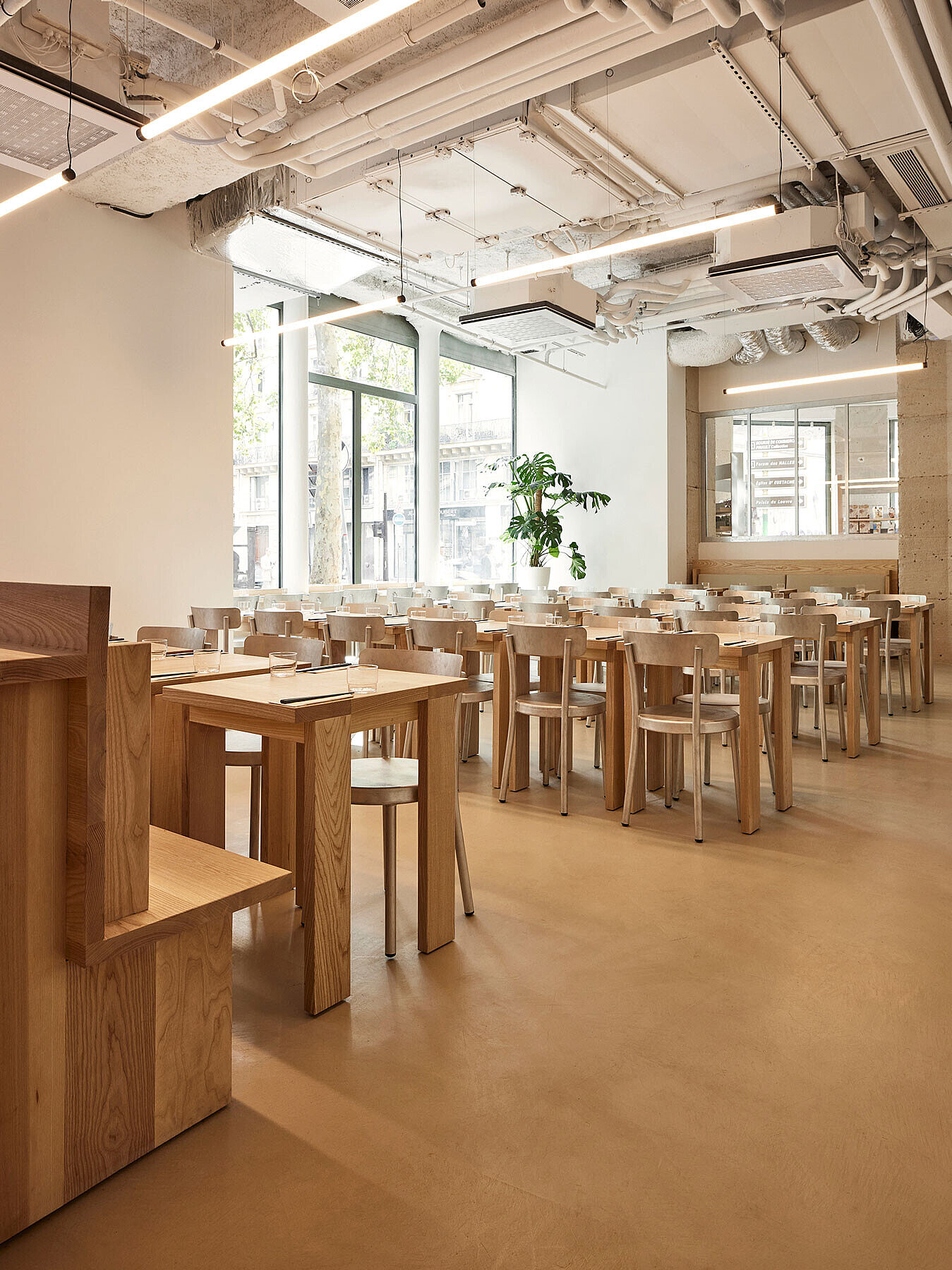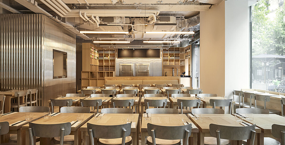 The architecture of iRASSHAi is the result of a collaboration between Hugo Haas and Yusuke Kinoshita, with support from Xavier Marchand and Thierry Maincent. Together, they have designed a contemporary space that combines both Japanese and Parisian elements. The challenge was to establish a cohesive aesthetic while preserving the unique identity of each area. To achieve this, they used the same materials: ash and chestnut wood, along with aluminum. The layout of the spaces on the premises follows the desire for coherence. From the SHOKUDO canteen to the KISSATEN café, iRASSHAi offers a variety of experiences, yet a unified design language runs throughout the entire space. Natural materials, exposed ceilings, and clay plaster are subtle nods to contemporary Japanese design.