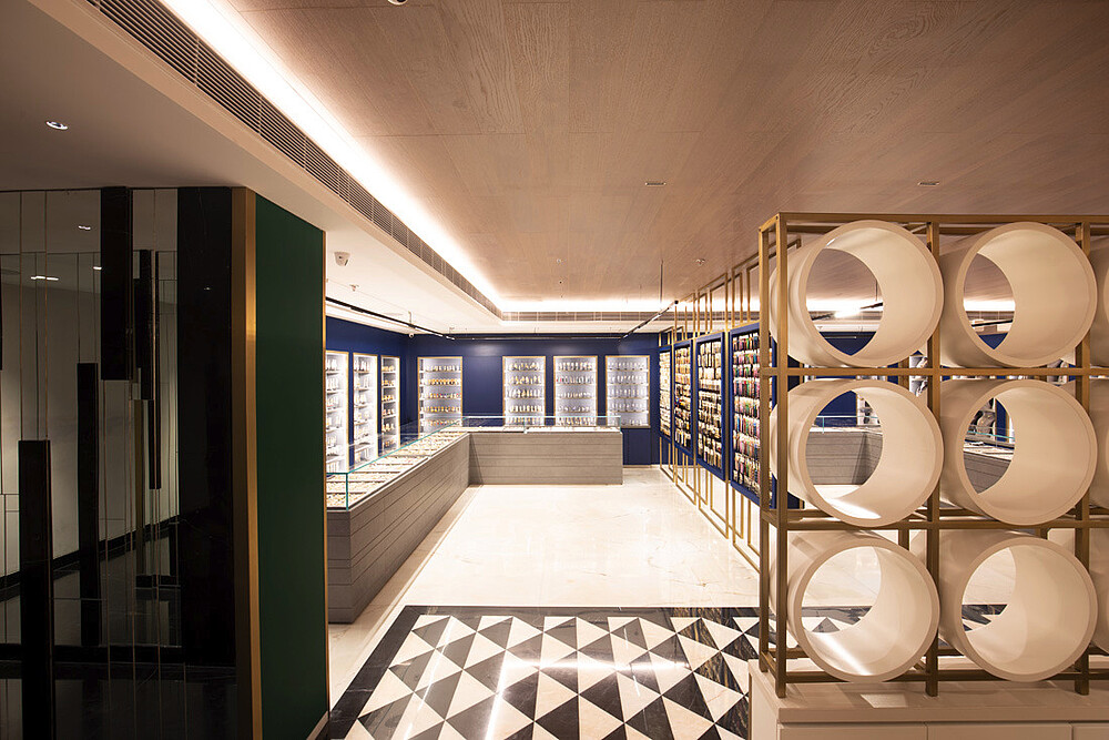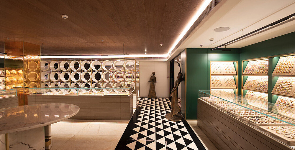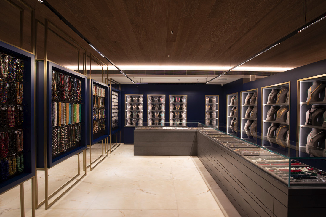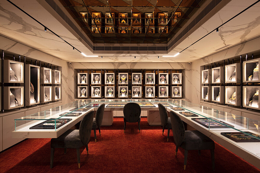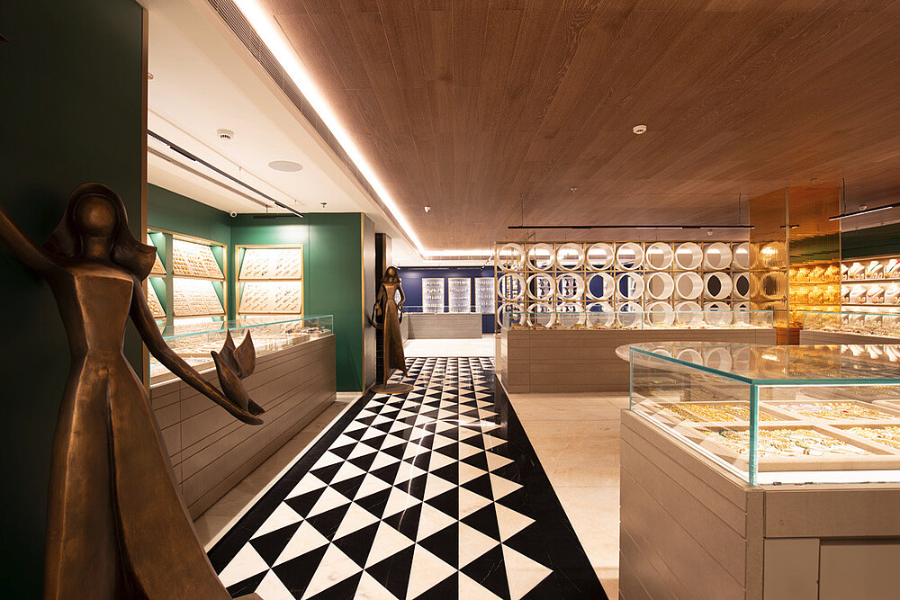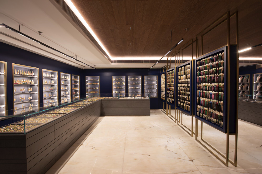 Jewellery display lighting in the walls and display counters have been planned separately by the lighting designer. The second layer with vertical illumination was considered so that a customer can have delightful lighting experience and can feel the beauty of jewellery.