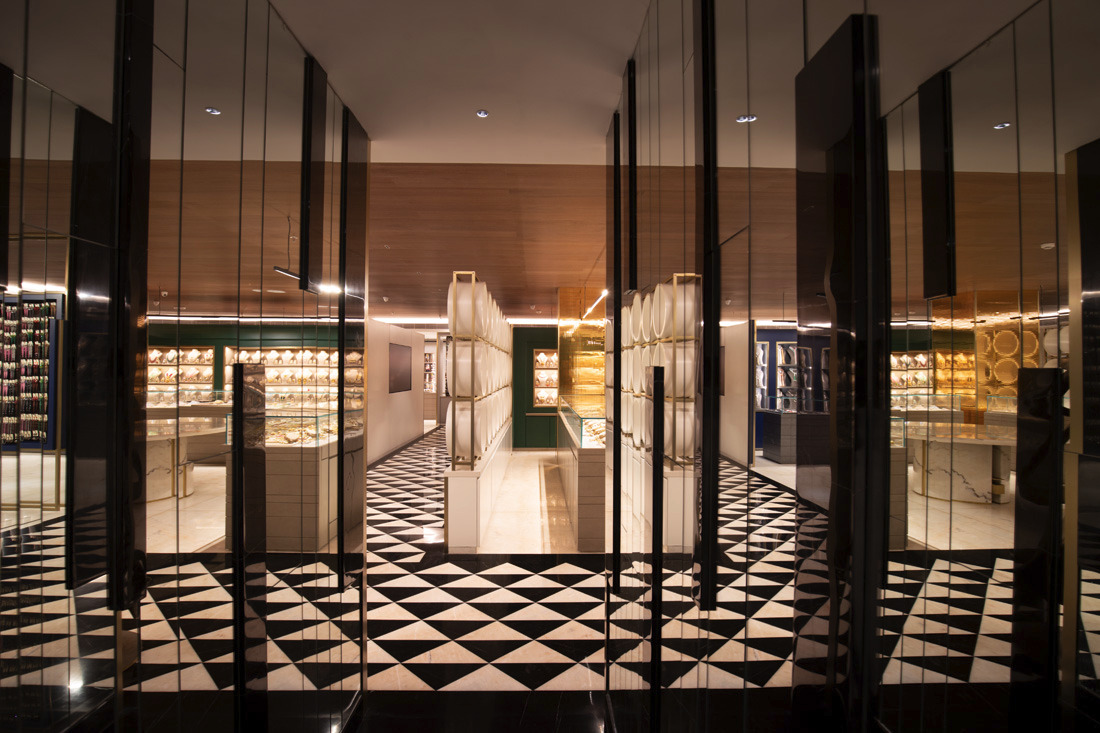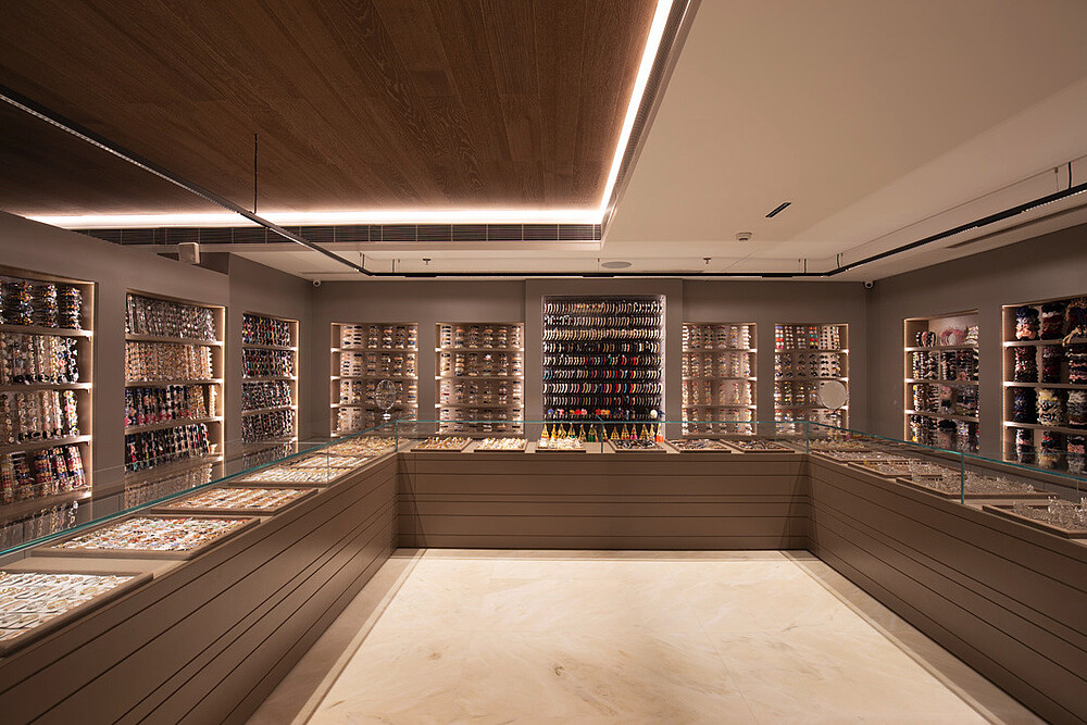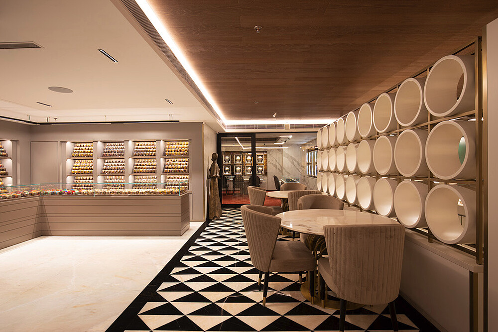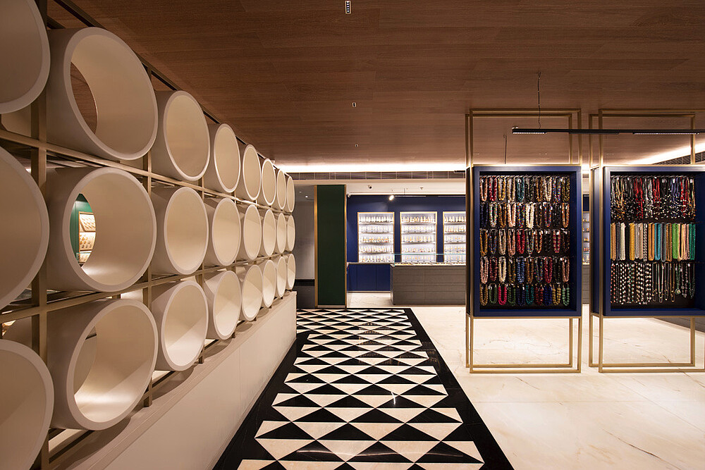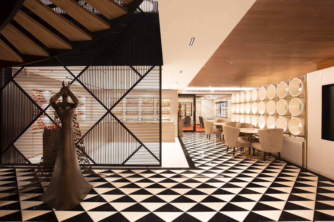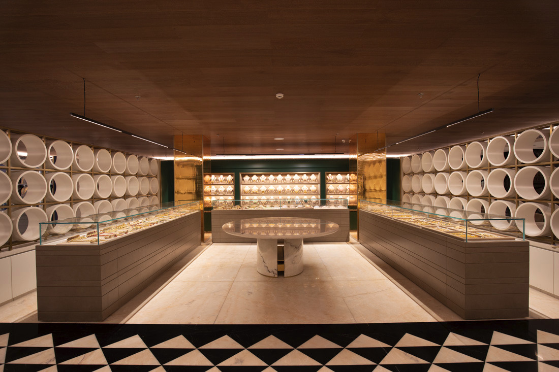 Jewellery display lighting in the walls and display counters have been planned separately by the lighting designer. The second layer with vertical illumination was considered so that a customer can have delightful lighting experience and can feel the beauty of jewellery.