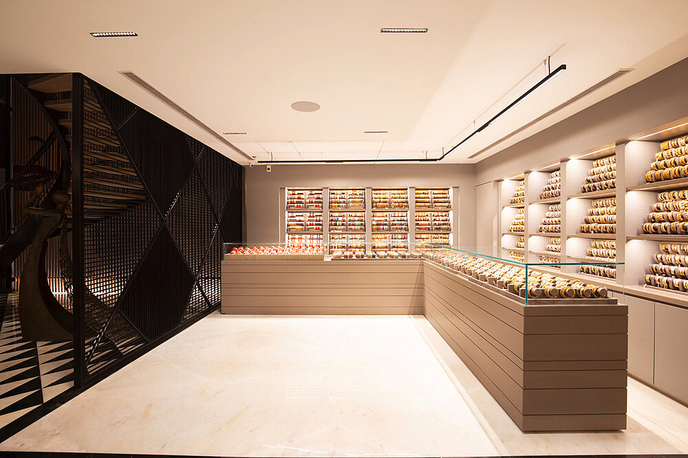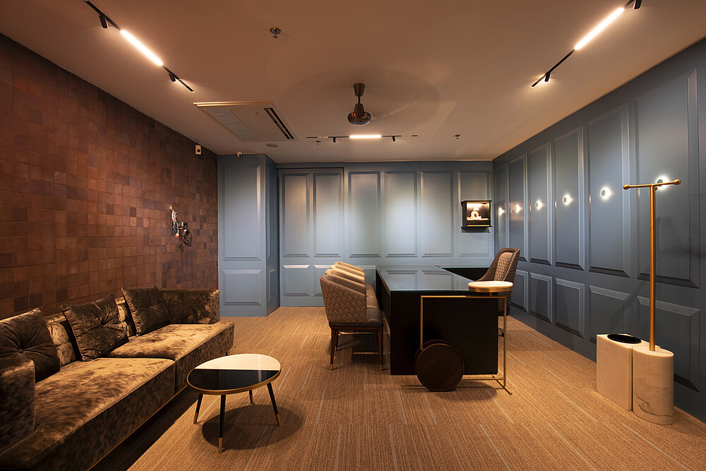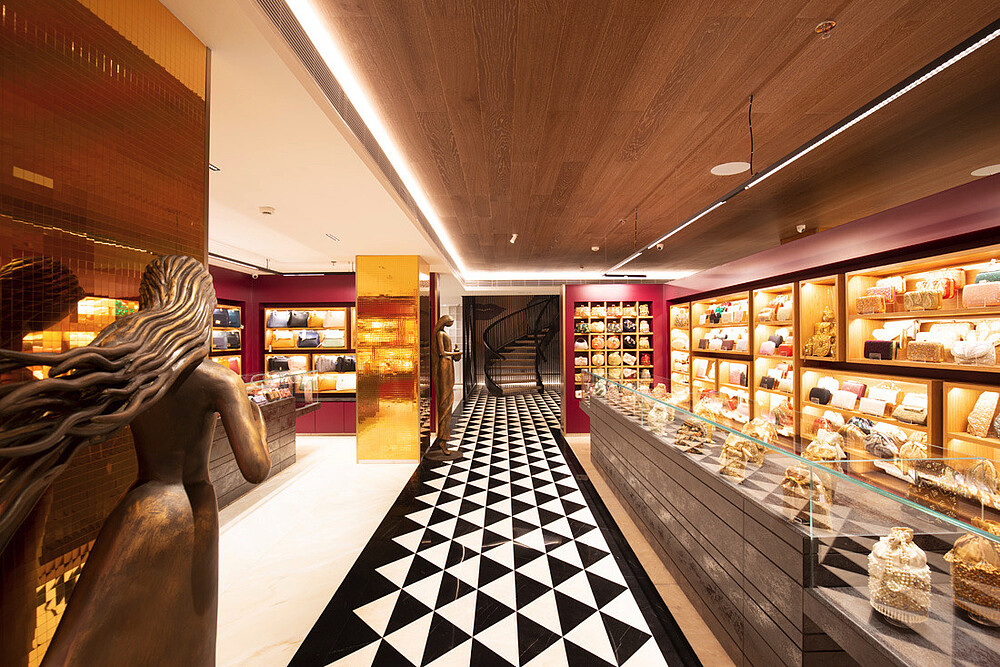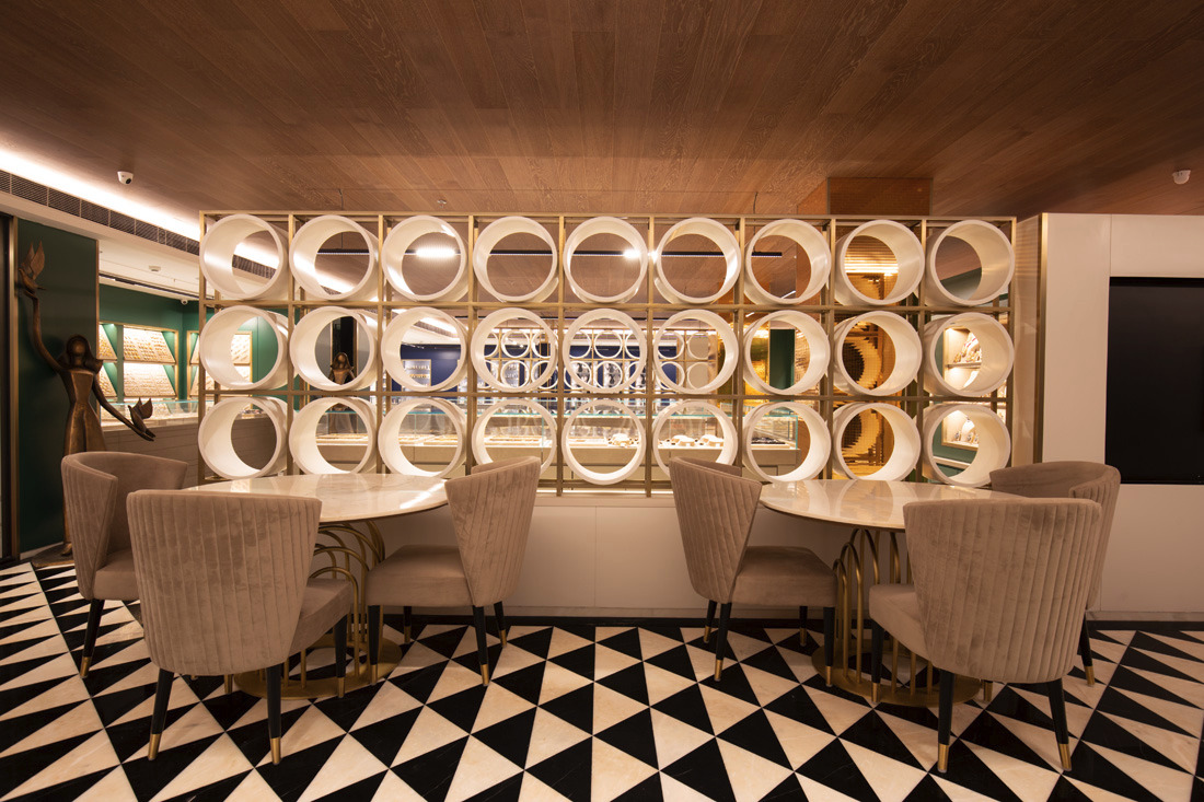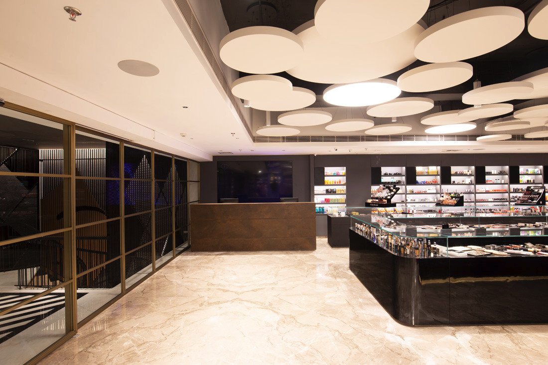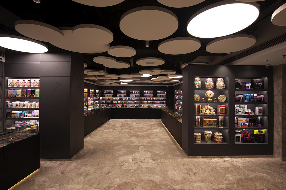 Jewellery display lighting in the walls and display counters have been planned separately by the lighting designer. The second layer with vertical illumination was considered so that a customer can have delightful lighting experience and can feel the beauty of jewellery.