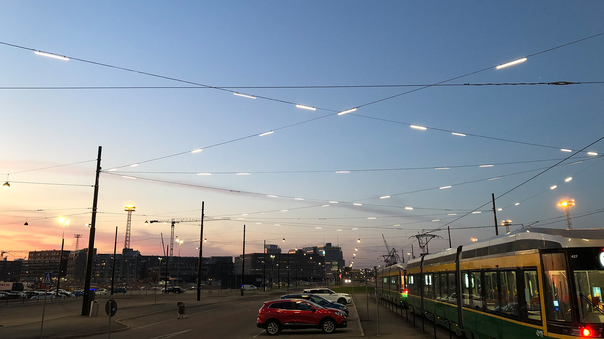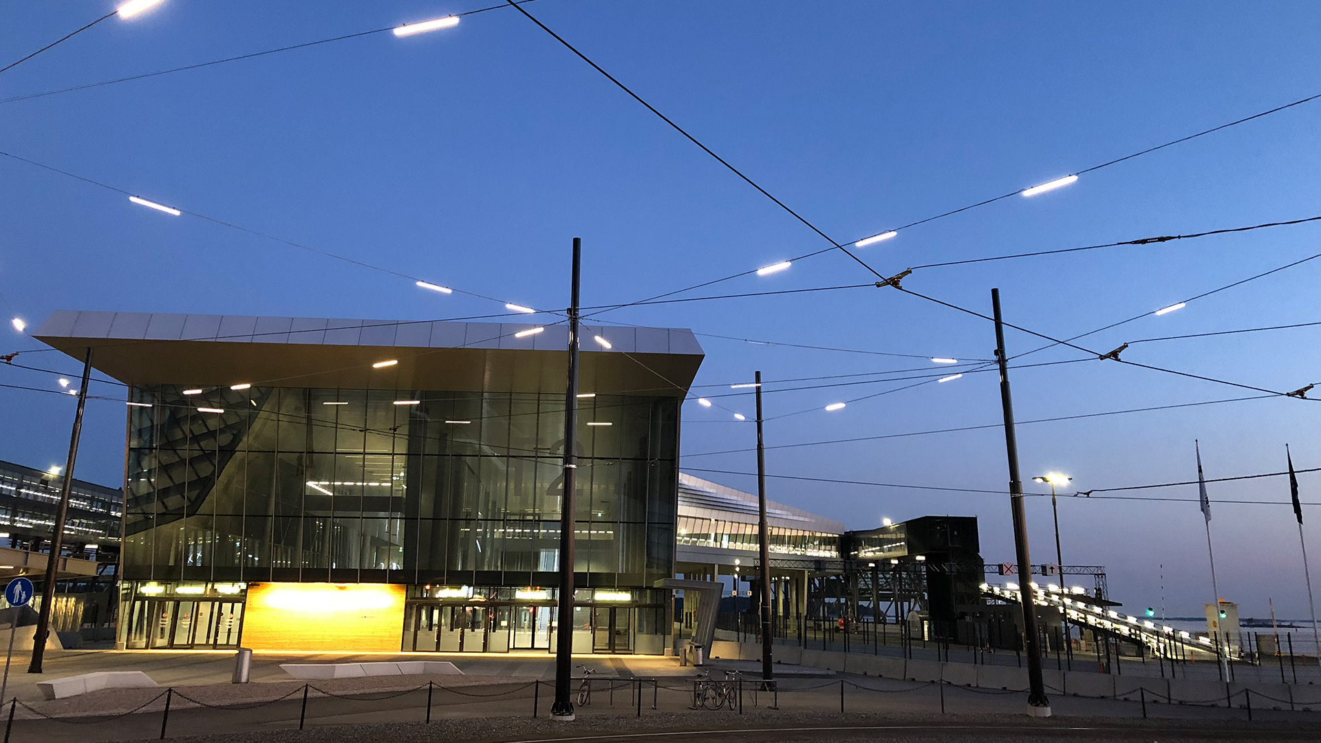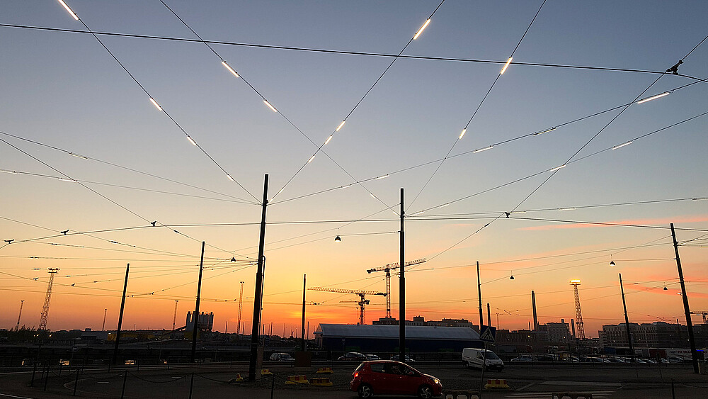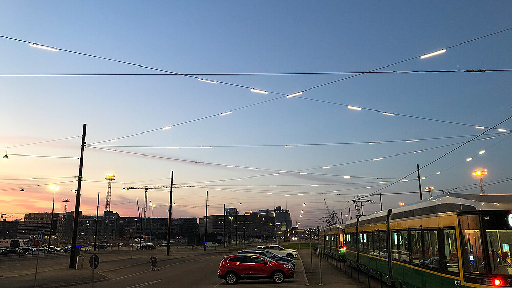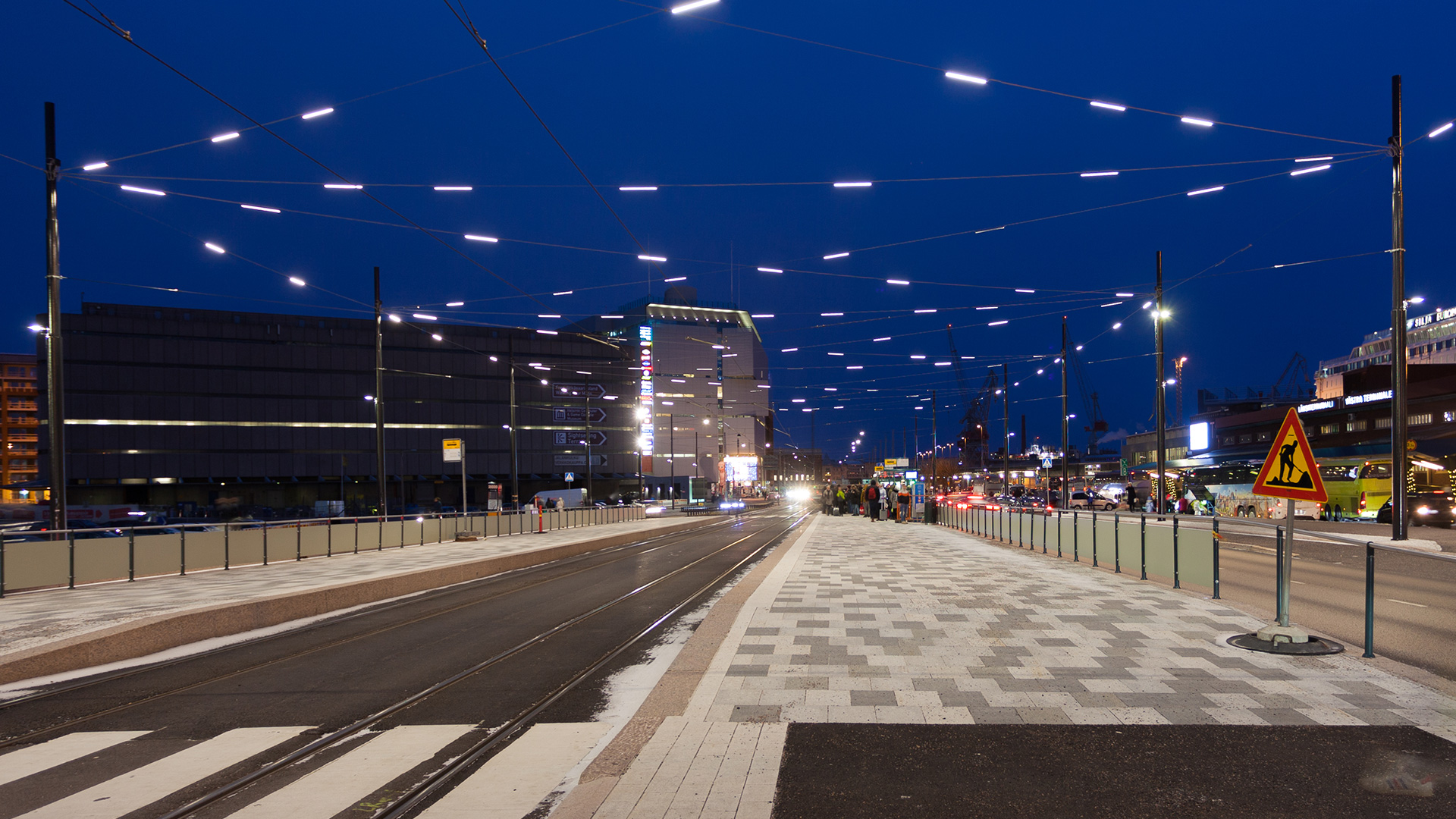 Länsi Satama is the newly developed ferry terminal in the Western harbour of Helsinki. The large square in front of the ferry terminal which also features the tram line terminal and loop is completely lit with a seemingly random pattern of KALYPSO fixtures suspended from a wire grid above the tram overhead lines. In order to allow for the unusual application a customization of the fixture and mounting accessories was developed for the project. It was used a KALYPSO HYDRA HD15 W 835 with a length of 952 mm, a beam angle of 60°and an IP protection class of 67.