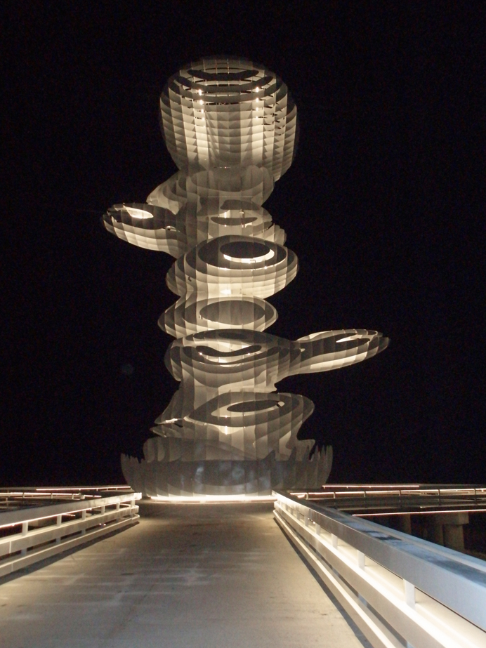 The pictures show Jürgen Mayer H’s sculpture in Lazika, a planned city in Georgia, located on the Black Sea. The 100-meter long new pier with about 31 meters high steel sculpture was to symbolize the start of construction of the new city. A dynamic, vibrant lighting of interior and exterior represents the sculpture at night as a new landmark.