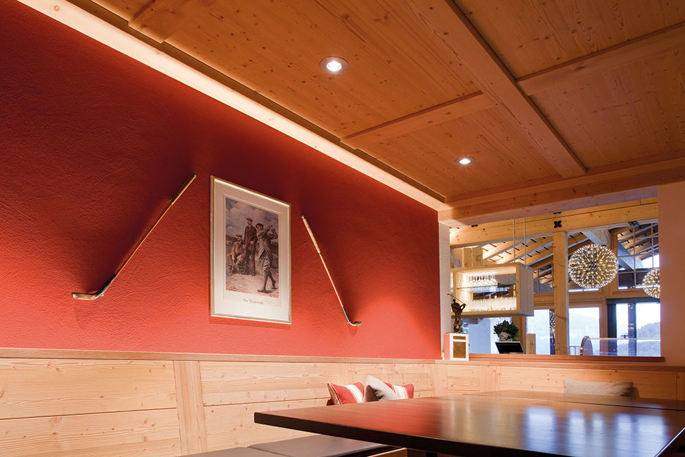 LIGHT ON highlighted the spaciousness of the restaurant with linear lighting solutions by LED Linear™, because the gabled wooden roof is illumined upwards with concealed LED strips (VarioLED™ Flex HYDRA HD25 in W827). For the exterior lighting, VarioLED™ Flex VENUS White TV IP67 in special profiles were fitted to the window ledges. The wooden plinths of the extensive patio feature LED lights with a direct/indirect light distribution characteristic. These illuminate the projecting roof and set the traditional woodwork effectively in scene. The glare-free illumination of the patio balustrade lends the external area a depth effect. The façade itself is brightened with maintenance-friendly LED lights which are designed so that no light is able to disappear upwards and that insects are unable to find their way into the interior area of the lights.