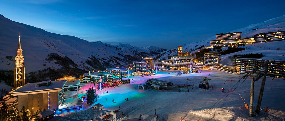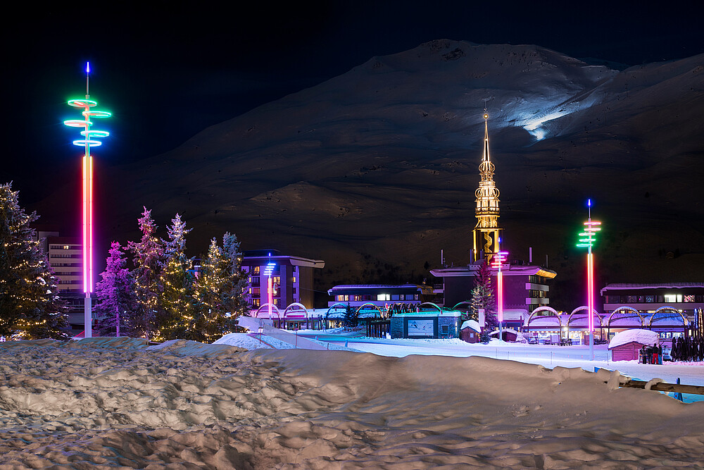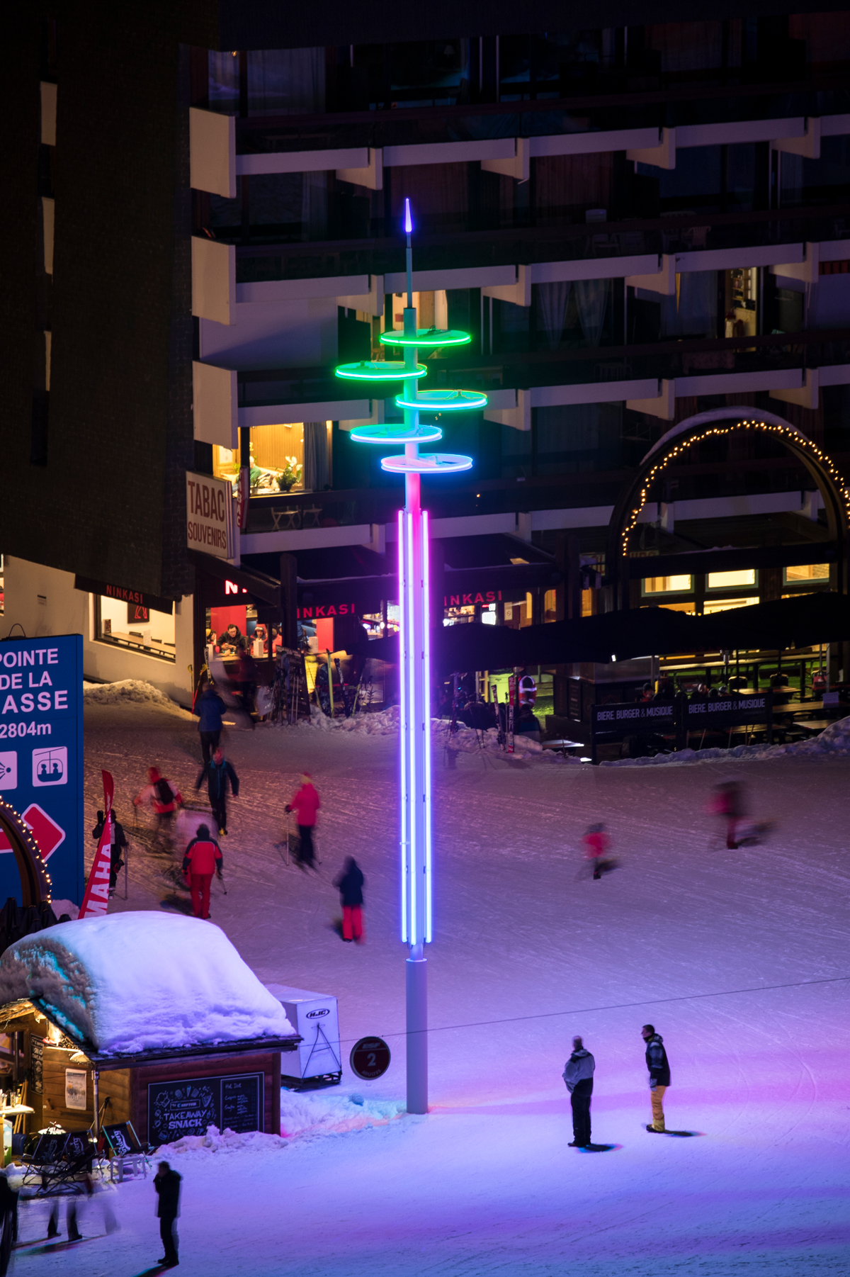 Les Menuires is the name of a wintersport place in the French Alps in the Départment Savoie. The whole place was equipped with architecturally innovative pylons. In this project the VENUS RGB was integrated into the pylons, so that the place shines in the evening in a beautiful warm colored light and once again it produce a pleasant feeling.