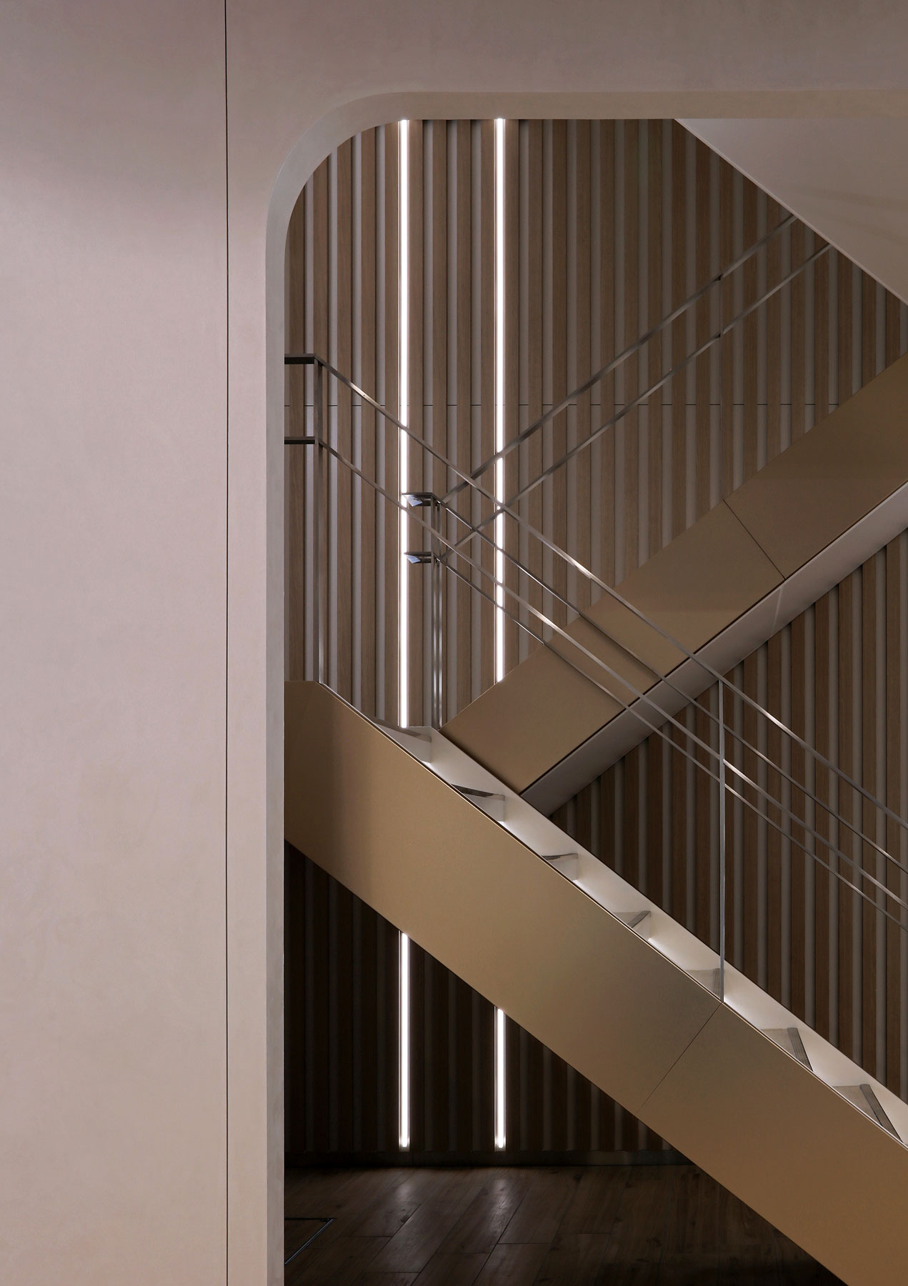 The aim of this project was to create a decorative lighting solution for the entrance area. This solution was intended to generate artistic patterns of light lines on the walls, ceiling, staircase, and various other areas, complementing the simple interior design.
