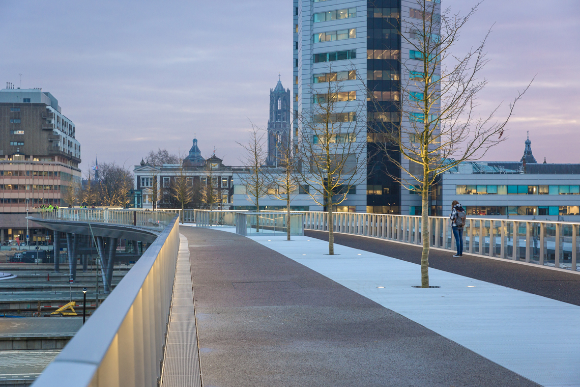 The Moreelsebrug (or Moreelse Bridge) is a bicycle and pedestrian bridge in Utrecht, Netherlands, spanning the railroad tracks to the south of Utrecht Centraal railway station. It is about 275 metres long and connects the Dichterswijk (Poet District) with Mariaplaats in the inner city district. It was named for Hendrick Moreelse, a 17th-century mayor of Utrecht. Designed by Cepezed Architects, the bridge has been described as “an architectural statement, a beautiful structure with graceful lines that opens up a pleasant boulevard in the middle of a busy city.” The handrails are pleasantly illuminated with the VarioLED™ Flex VENUS.