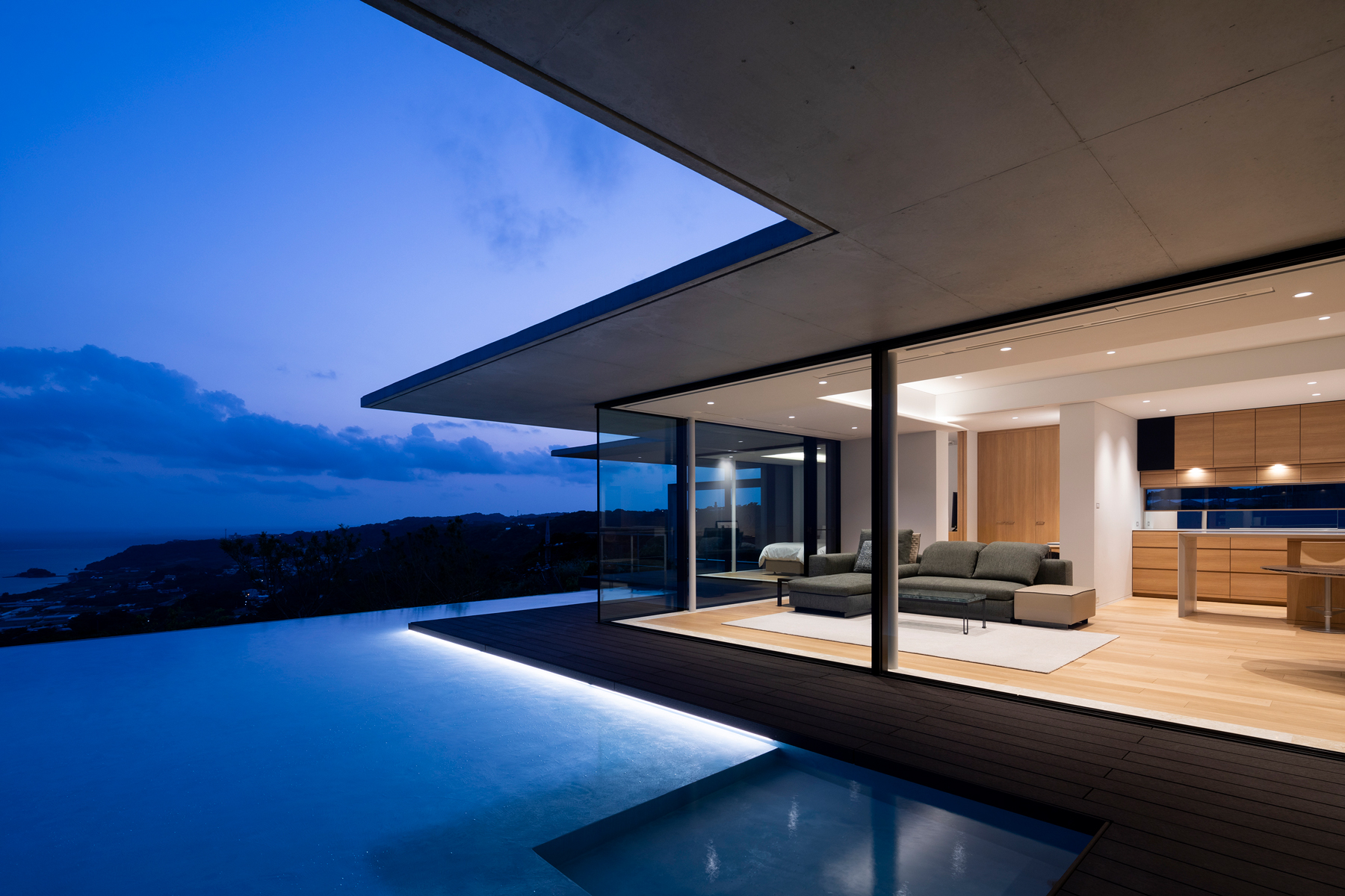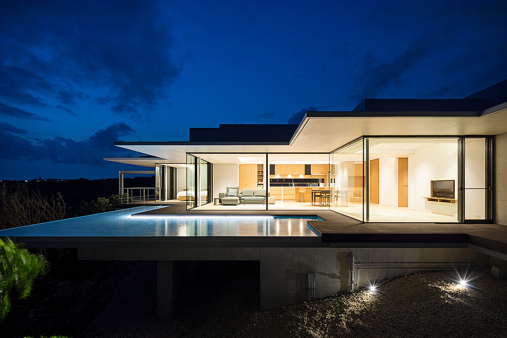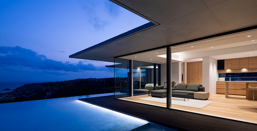 The luminaire creates a clear line of light underwater along the L-shaped pool, stylishly illuminating every corner.