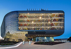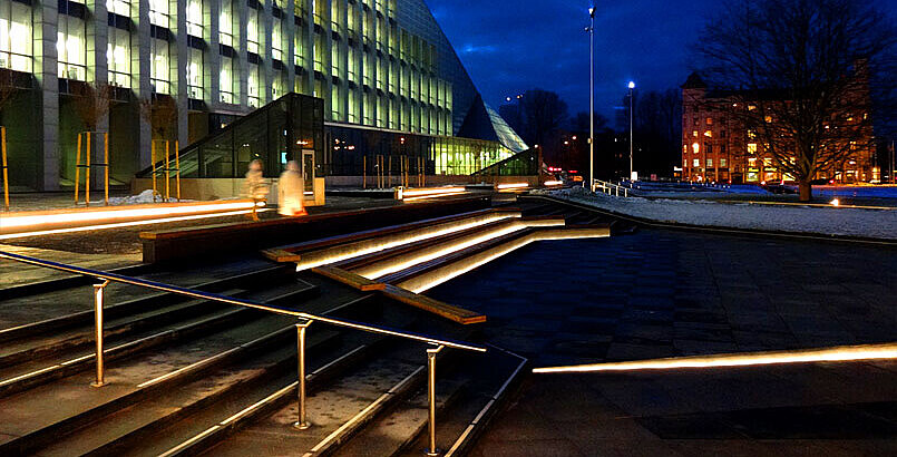 For the illumination of the steps in front of the building, VarioLED™ OCEANOS White IP67 in 3,000 K was used. The fully encapsulated luminaire, made of stainless steel, has been designed for in-ground installation. The homogeneous light over the entire light-emitting surface sets appealing light accents and offers orientation and safety for pedestrians who are walking on the stairs at night.