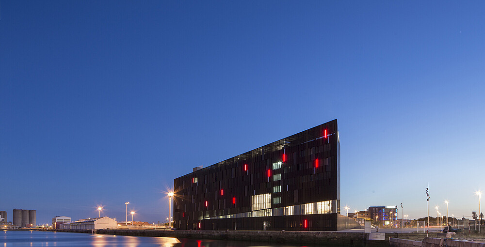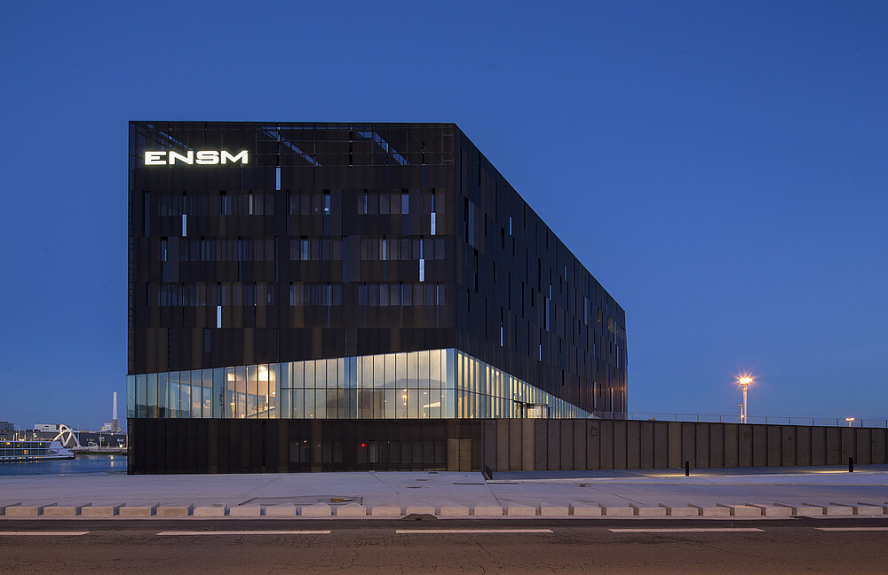 The SOGEA construction/ AIA/ ECHOS/ ECONOMY 80 consortium was selected to design and implement the ENSM du Havre. Compact and chiseled, the architecture of the new school of Marine imposes itself in the urban context with its monochrome skin. Metallic, with changing reflections, according to the seasons, the hours of the day and climatic variations, to make it a marine organism and living urban.