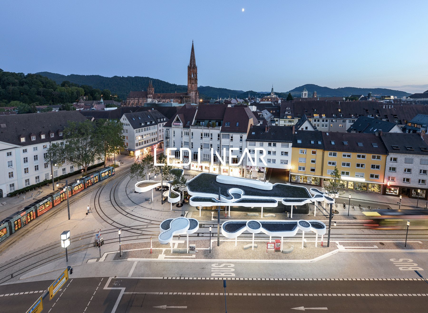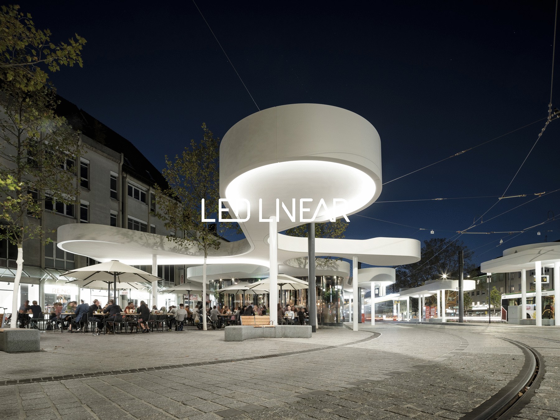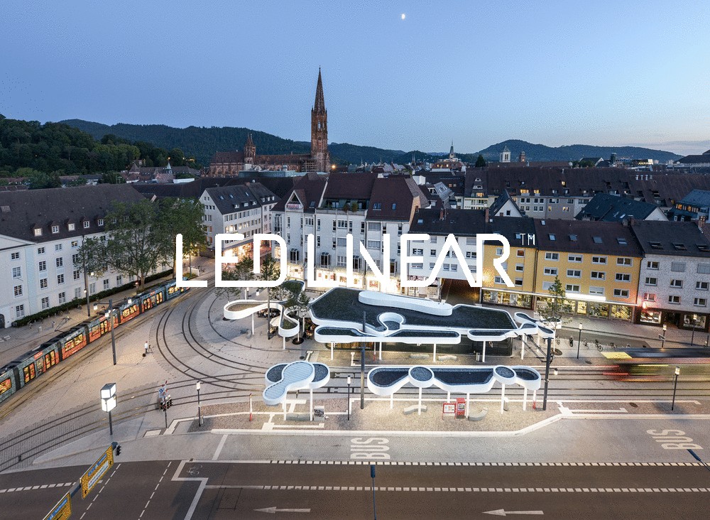 The pavilion houses a new tram and bus station including gastronomy and spaces for the VAG which is combined in a joint building. The expansive roofing with its curved form shapes the new appearance of the square. The pavilion becomes a communicative place and meeting point that combines the needs of public transportation and urban experience. At dusk and at night, the canopy panels give a pleasant and welcome light. The panels are backlit with VarioLED Flex™ PHOBOS Top View in 2700 Kelvin.