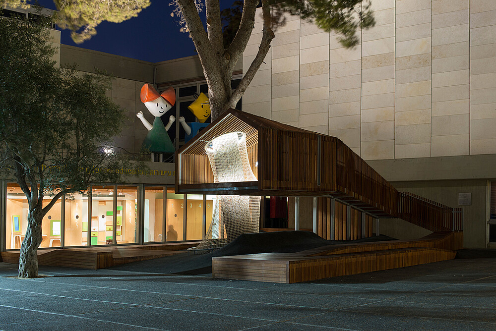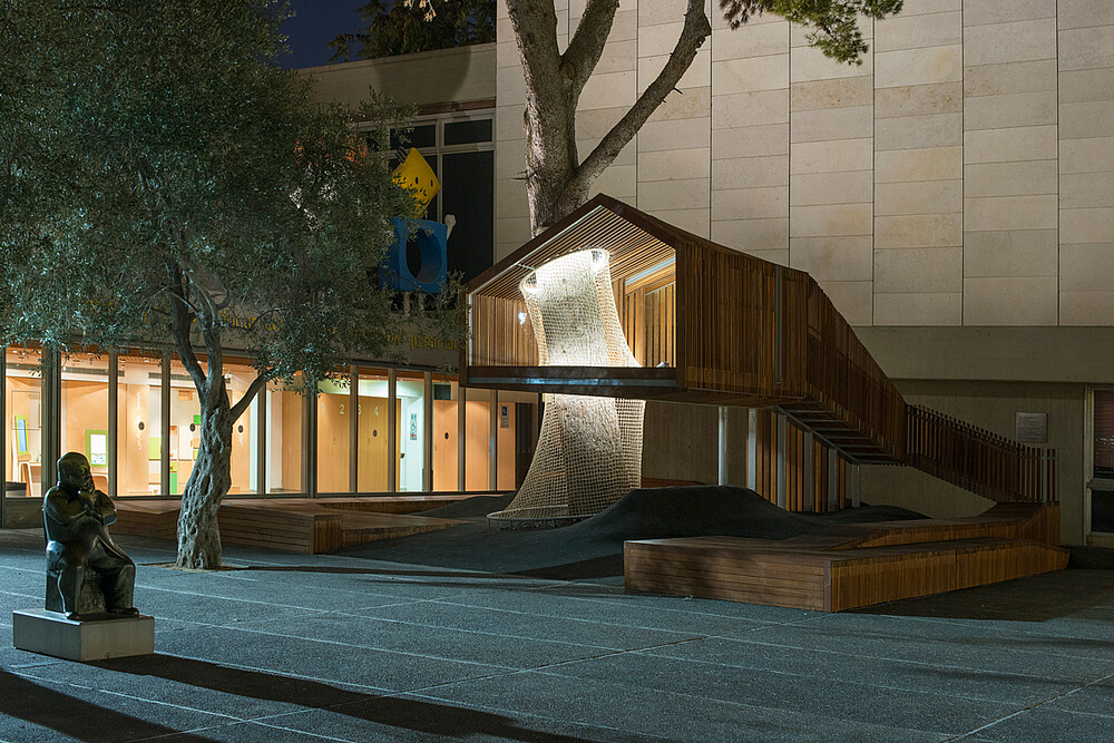 The entrance courtyard of the Youth Wing for Art Education at the Israel Museum in Jerusalem is a main gathering place for visitors - adults, children and groups - within its modern concrete and stone architectural surroundings. The project - a renewal of the courtyard - combines a program open to interpretation by its users with a clearly defined context. The existing pine tree is the focus of the project, the physical anchor of the design concept. As a tribute to the childhood collective memory of a tree house, a small roofed structure where children can hide and over look at, is positioned high up the tilted trunk, raised above the surroundings of the museum. At night the house is the only element illuminated, and emerges floating above the courtyard's entrance.