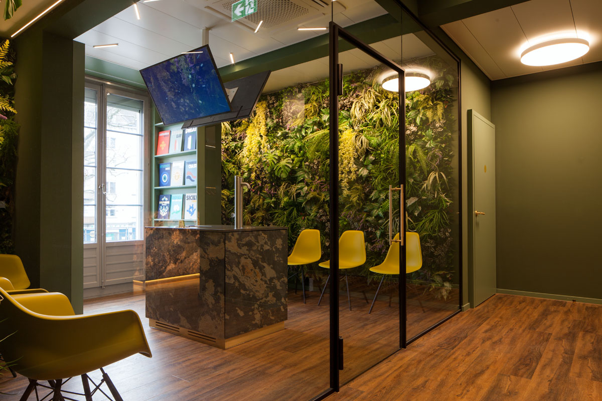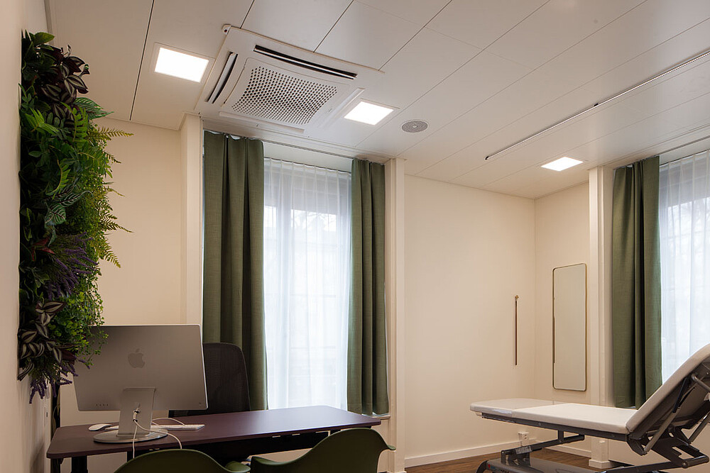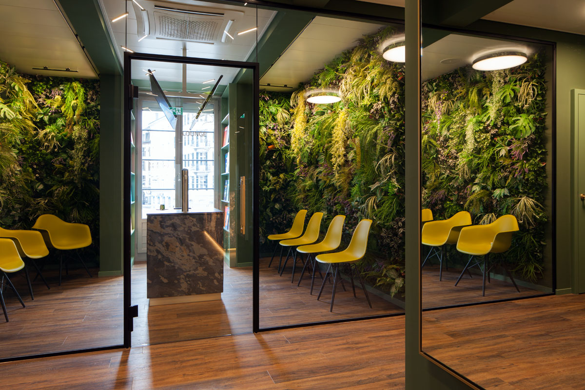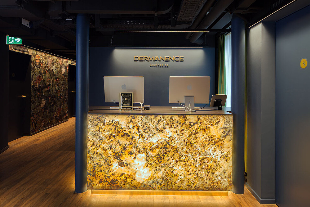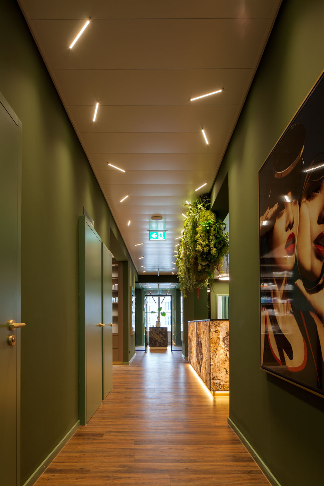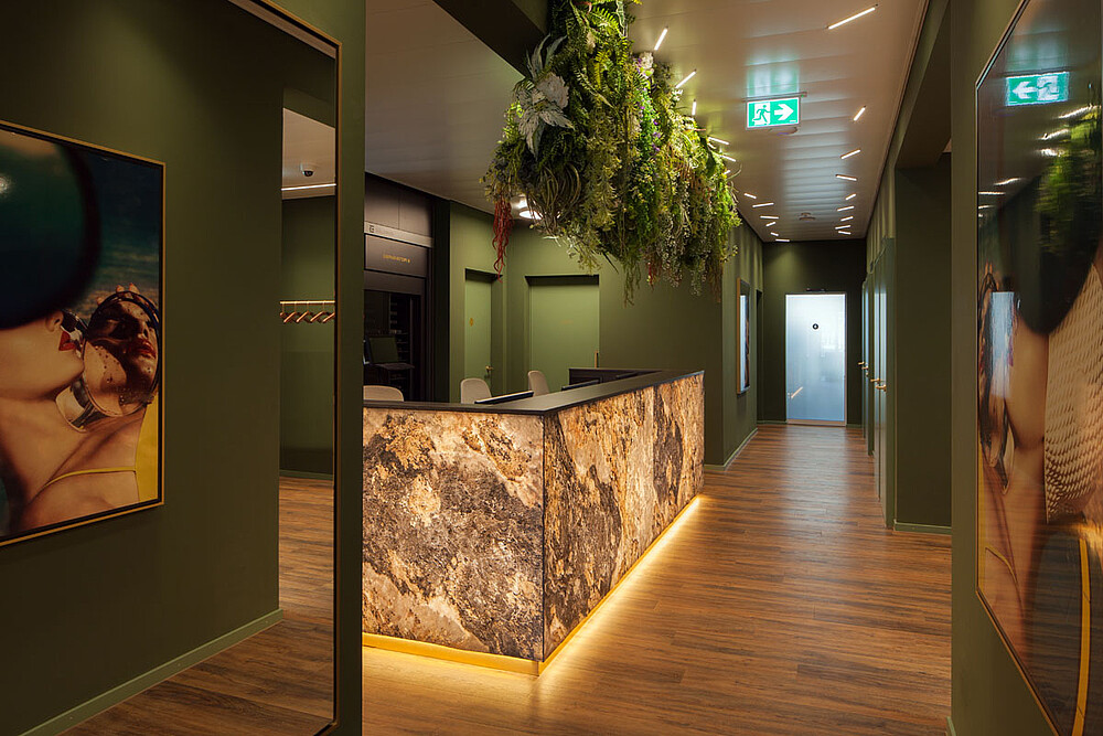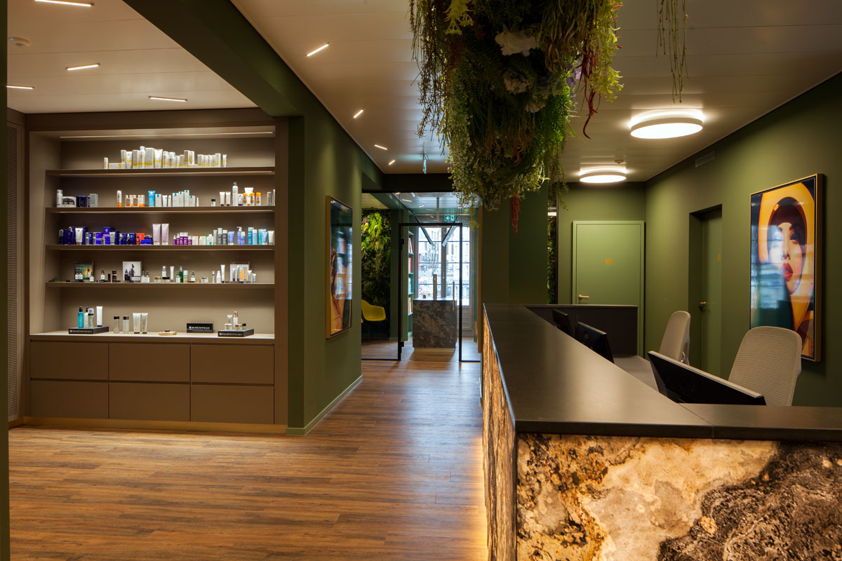 An exceptional interior and lighting concept was implemented for the second competence center of the dermatological clinic Dermanence. Lush, expansive greenery creates a pleasant ambiance. Calming shades of green enhance the feeling of comfort.