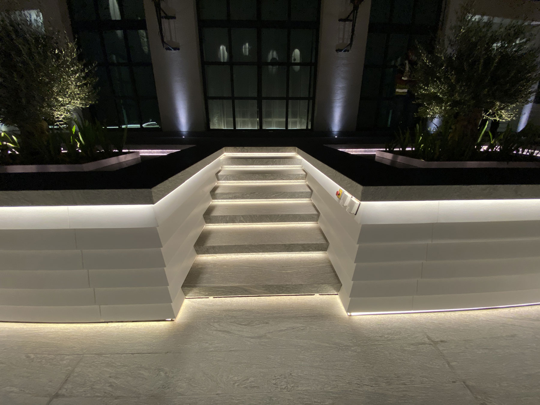 The VENUS True Color IP67 and NEPTUNE IP68 luminaires were integrated into the landscape area, creating a natural contrast with the surroundings by bringing light variations to the vertical plane. The simple and modern design of the luminaires makes them fit perfectly into the geometry of the outdoor area.