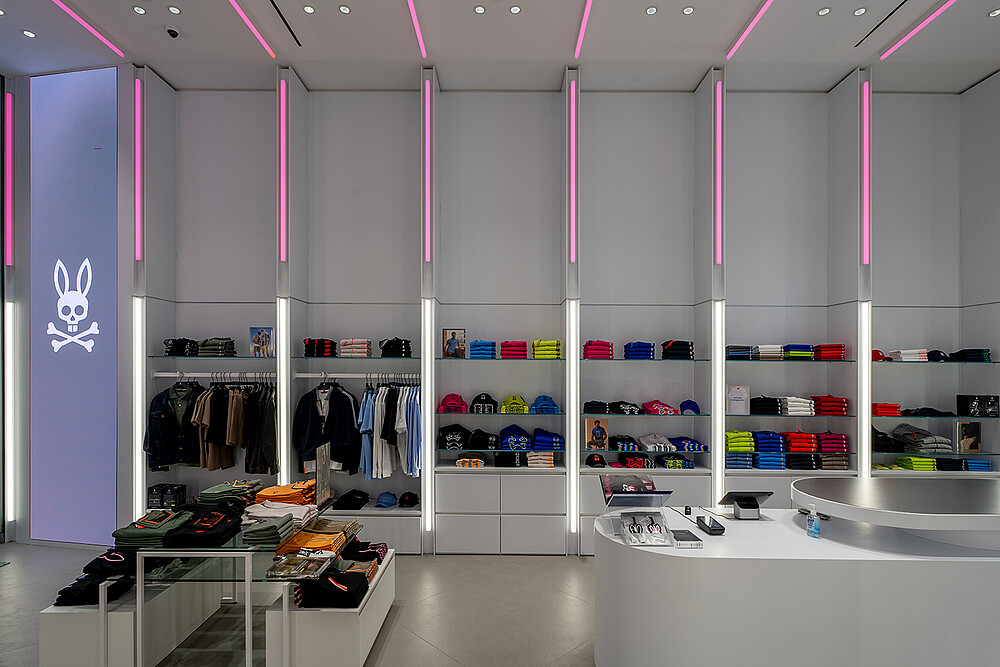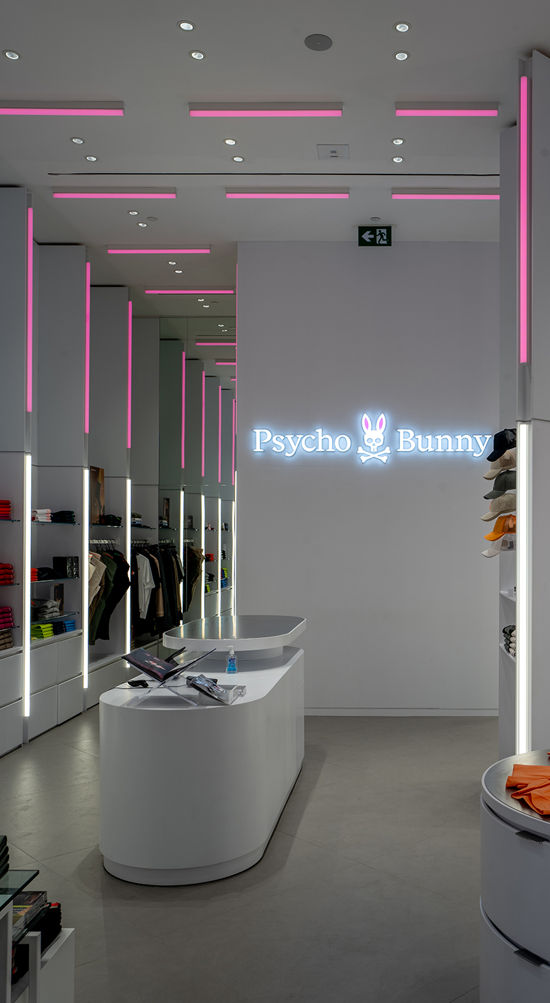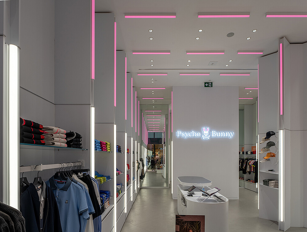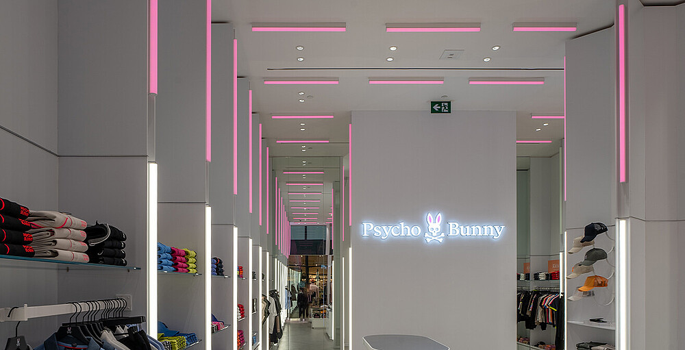 For the store's lighting, a special solution with the XOOTUBE™ IP40 was implemented. These luminares were installed in an RGBW wall and ceiling mount throughout the store. They illuminate in pink and white, highlighting the vibrant and unconventional atmosphere of the Psycho Bunny flagship store and creating a unique shopping experience.