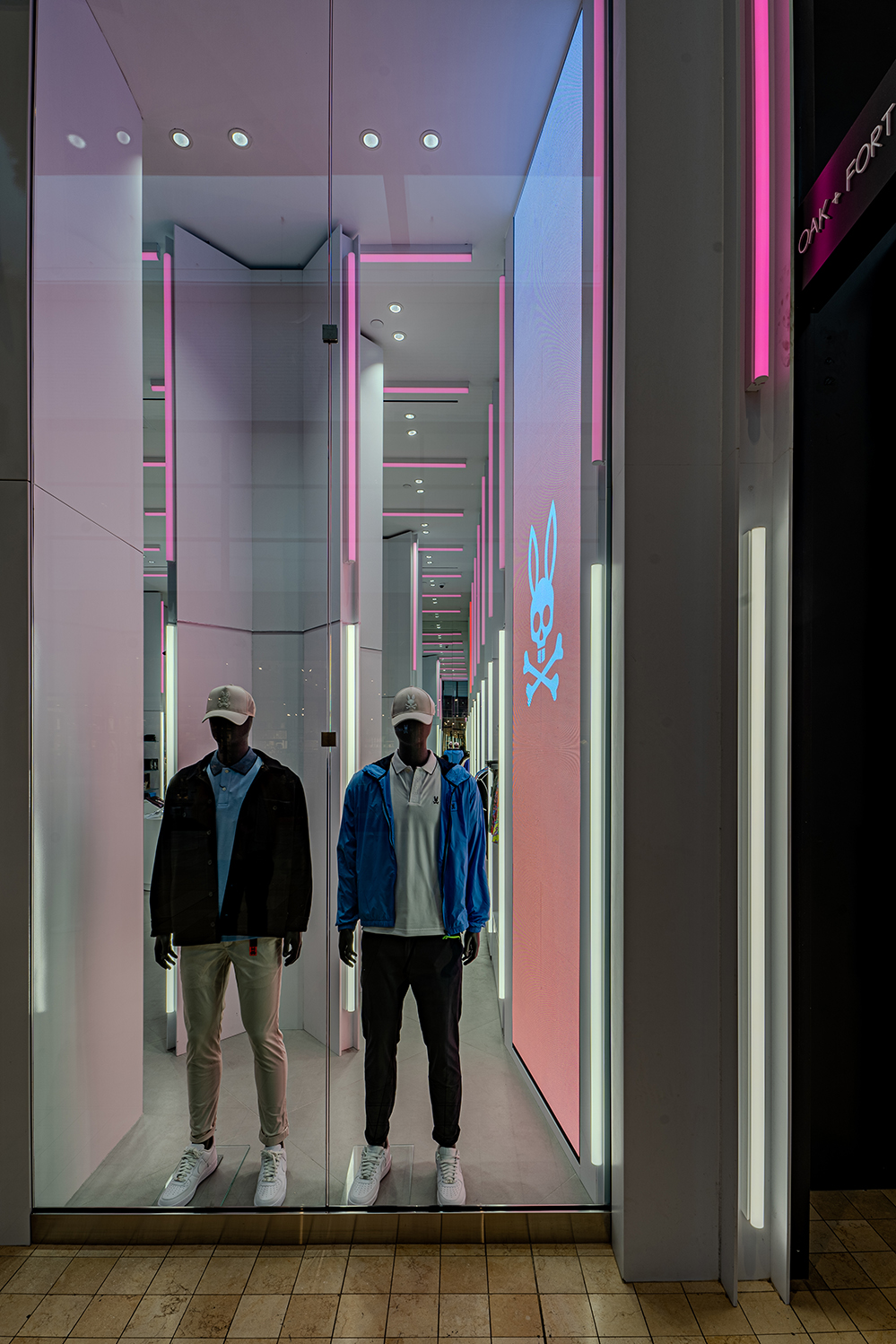 Located on the ground floor of Yorkdale’s Shopping Centre, the concept space aims to embody the twisted, irreverent attitude of Psycho Bunny through a whimsical shopping experience. The store houses a larger-than-life LED video wall and a full curated line, including T-shirts, polos, swimwear and an all-new accessories range.