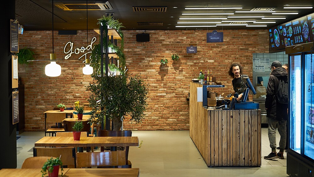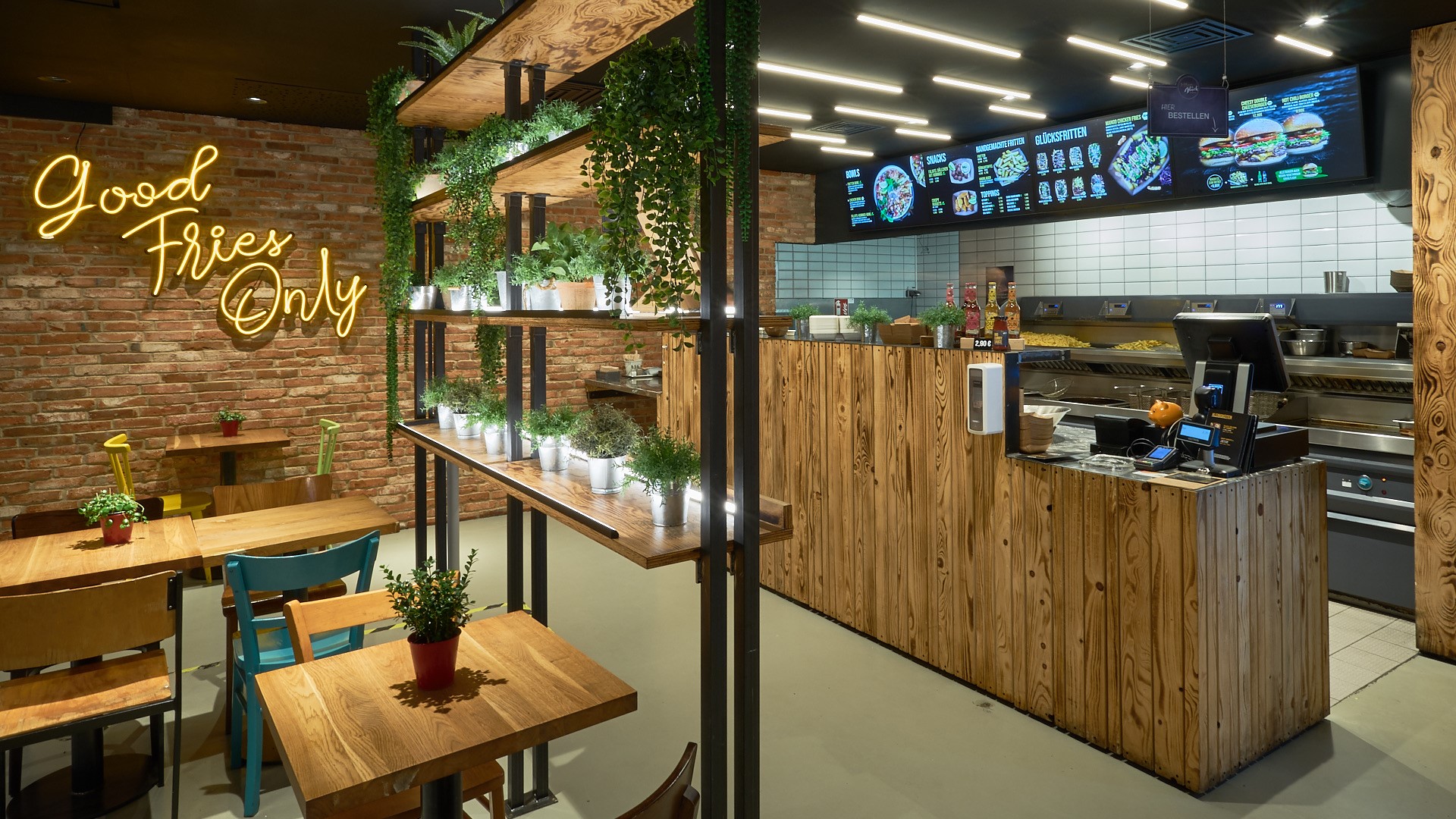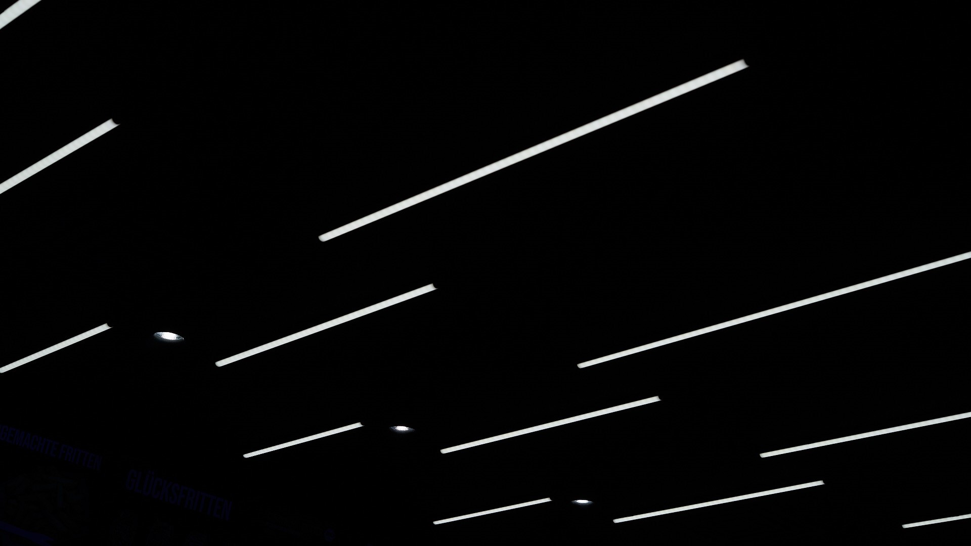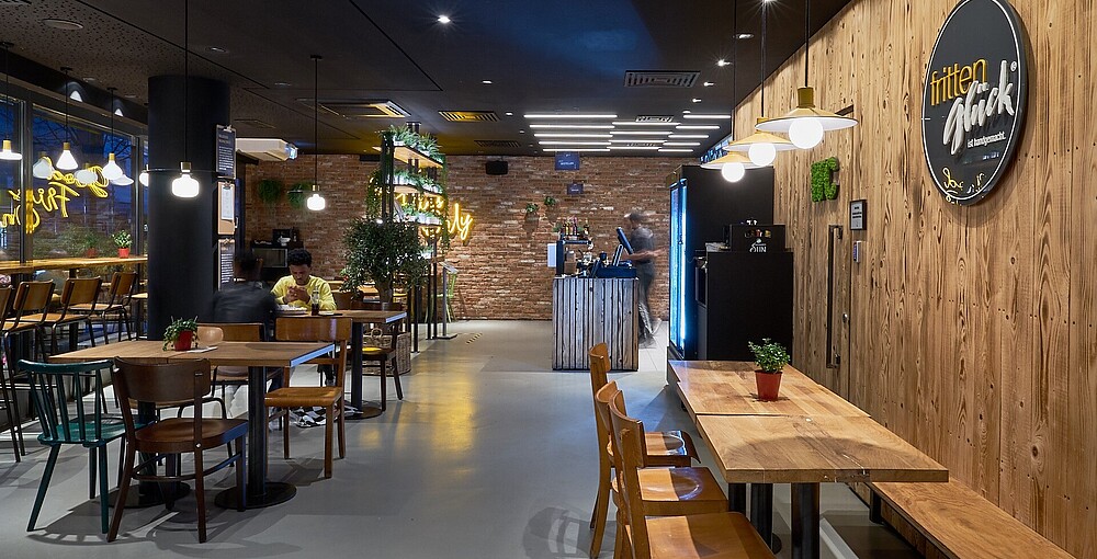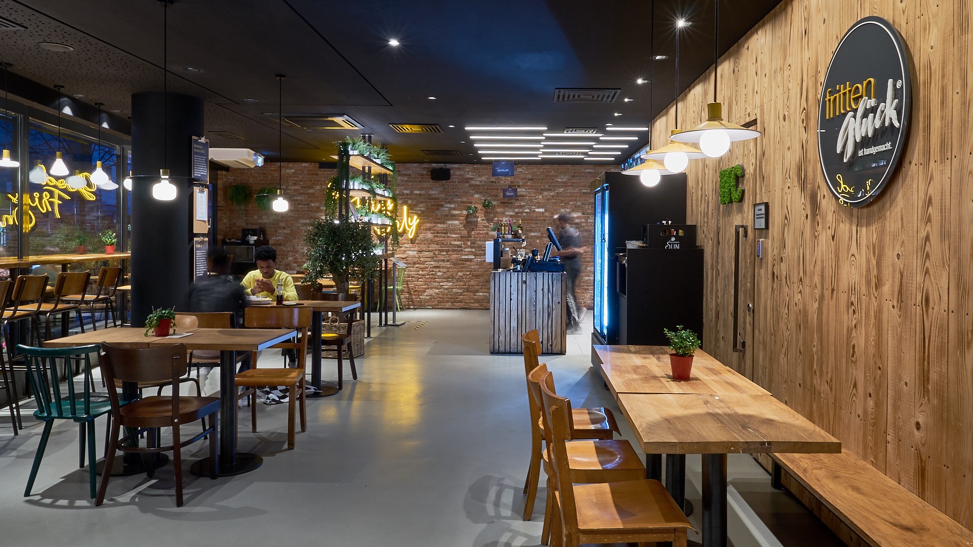 The lighting designers opted for the LYRA luminaire with opal optics. The narrow surface-mounted luminaire - in linear form in the analogy of a French fry - was staggered in 3 different lengths on the ceiling. The counter area is thus the brightest area in the restaurant and becomes an eye-catcher for customers. For the color temperature, 2700 Kelvin was chosen.