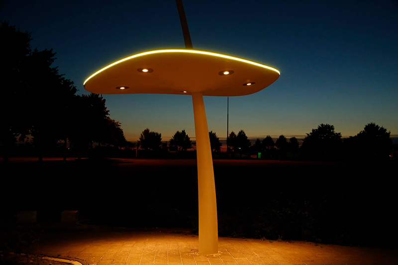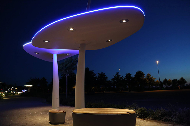 The newly created roofings on the boulevard in the Dutch town of Emmen protect passers against weather conditions while waiting or lingering and attract many visitors at any time of the day through their exceptional design. Their organic shape is emphasized with a VENUS design light line in RGB, which provides atmospheric lighting and color accents in the dark. The diffuse light also creates a cozy atmosphere.