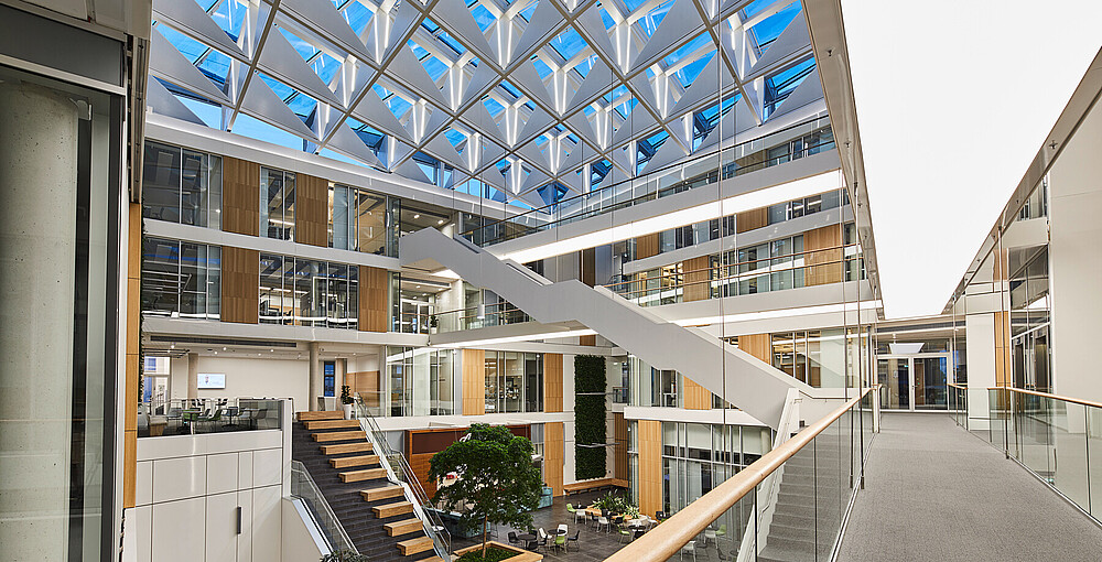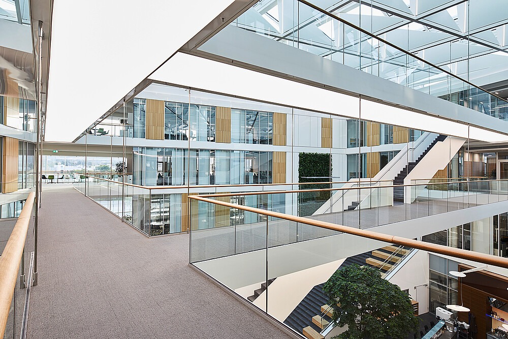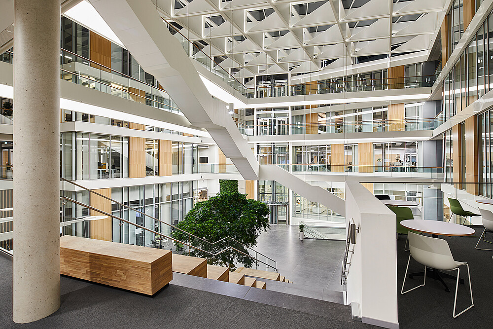 The heart of the building is the atrium, which, with its unique architecture and affirming lighting design, is intended to reflect the company's pioneering innovative strength.