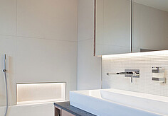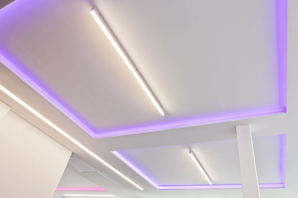 To create a lighting situation which enables both good work and an appropriate atmosphere despite a low room height, LIGHT ON uses two complementary systems. The key element is provided by LED luminaires with an opal coverage which are installed in a ceiling opening. To illuminate the ceiling and the ceiling opening on a simultaneous and even basis, the strips’ protrusion from the recess is unnoticeable. In addition to this, the ceiling sections, which make the room look higher, are illuminated by invisible LED strips. Different color moods can be chosen freely with this RGB solution.
