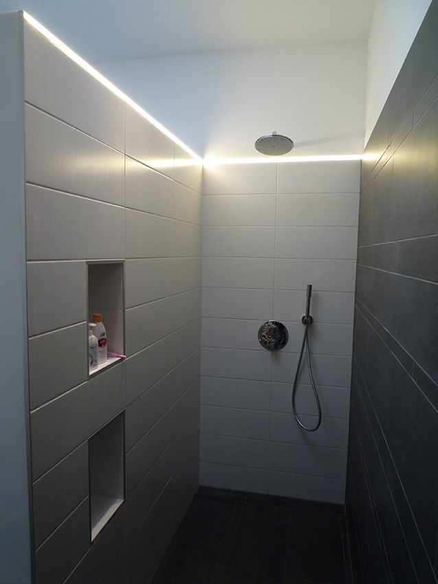 To create a subtle light line in the shower, the VarioLED™ Flex VENUS with a color temperature of 2,900 K (W824) was used. Due to the opal encapsulation and the emerging homogeneous light this design light line is an appealing accent lighting in living areas. As a result of the selected light color the shower is warmly illuminated and promotes the well-being of the user. By their encapsulation the light line is also resistant to water, chlorine and water vapor and is therefore well suited for the use in bathrooms, swimming pools and spa areas.