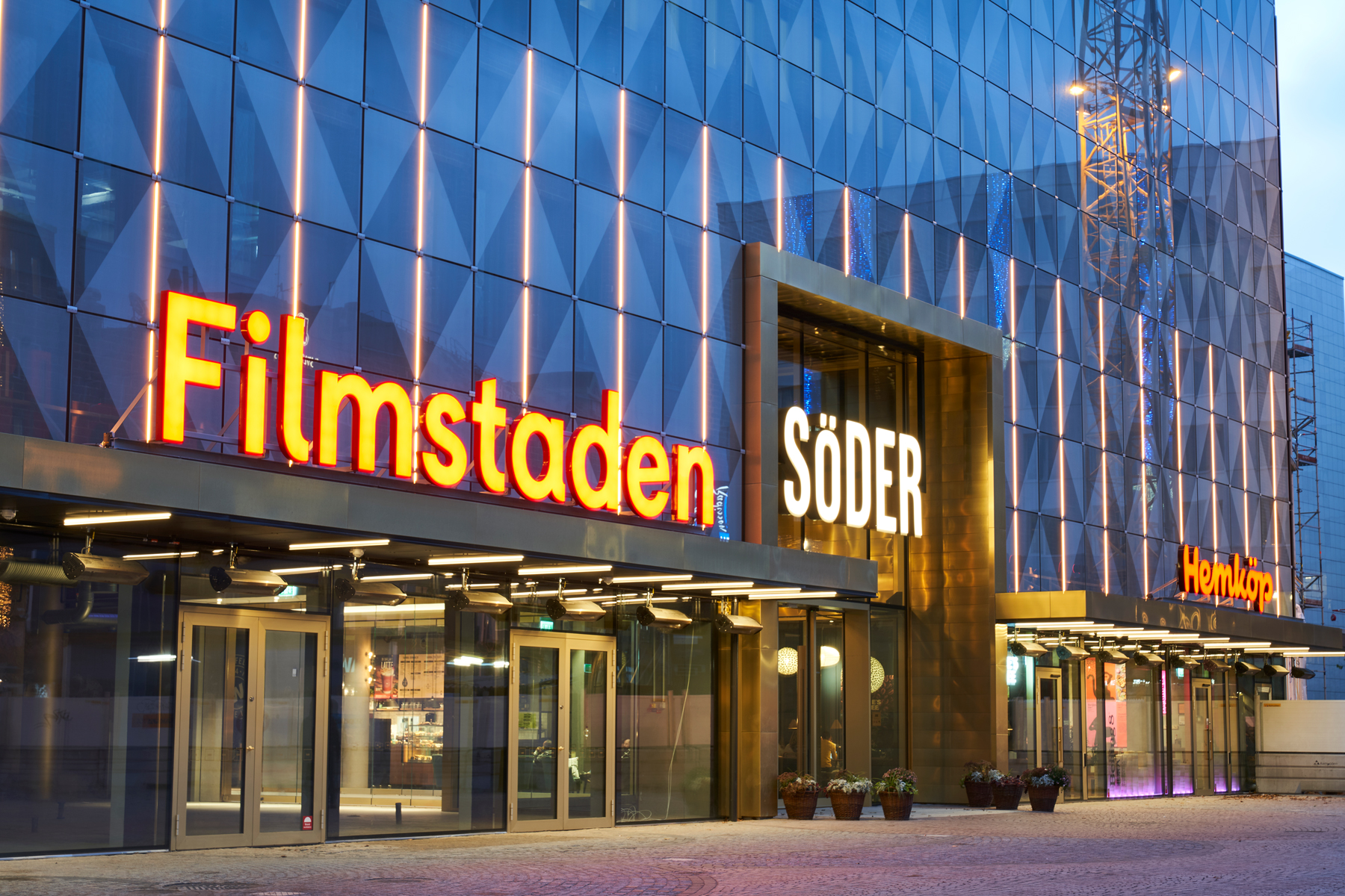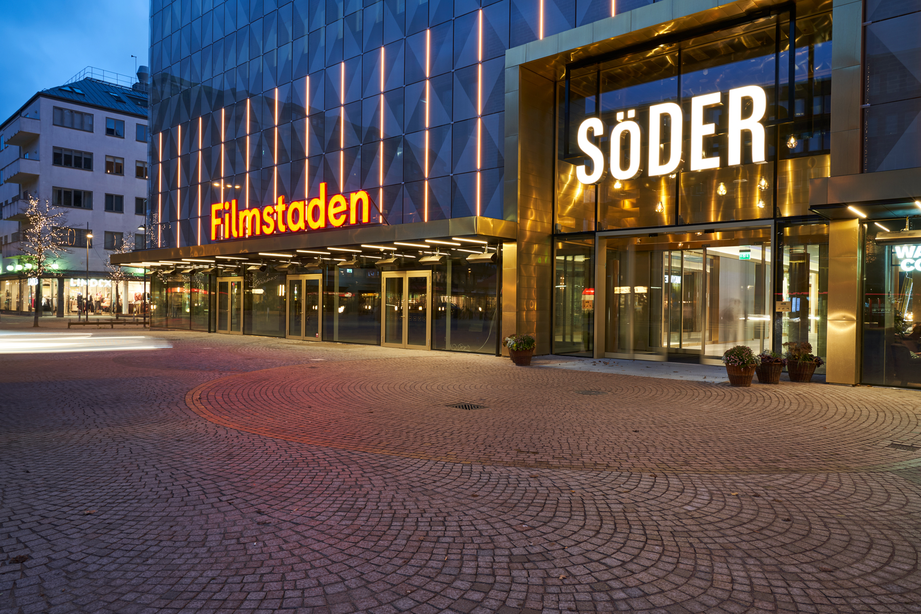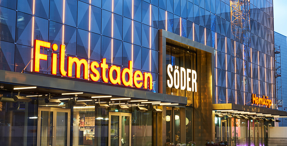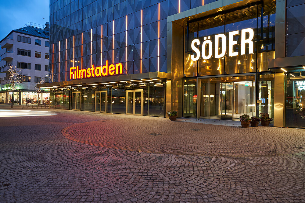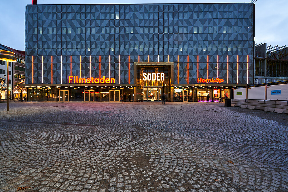 What was originally a department store, built in the 60's, got new screen printed glass facades and a thorough renovation. It became a shopping mall including cinema, grocery store, restaurant etc. Through good architecture, the public spaces are loaded with activity. This is just one of the blocks of Helsingborg's gigantic urban renewal project H+, which aims to densify and connect the district called Söder with the new neighborhoods that are built in the old harbor areas.