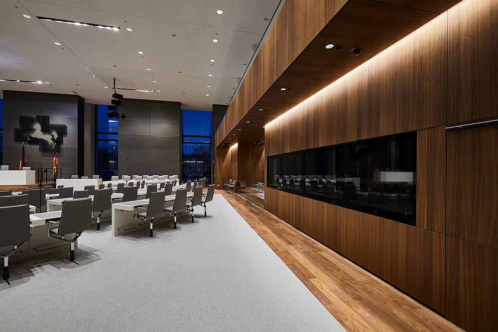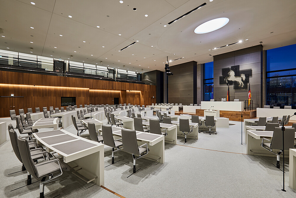 From 2014 to 2017, the plenary section of the existing building was modernized, and the traditional building carefully harmonized with contemporary functionality. Today's plenary area is transparent, modern and flooded with light. The claim to be an open house for the citizens is now also architecturally apparent.