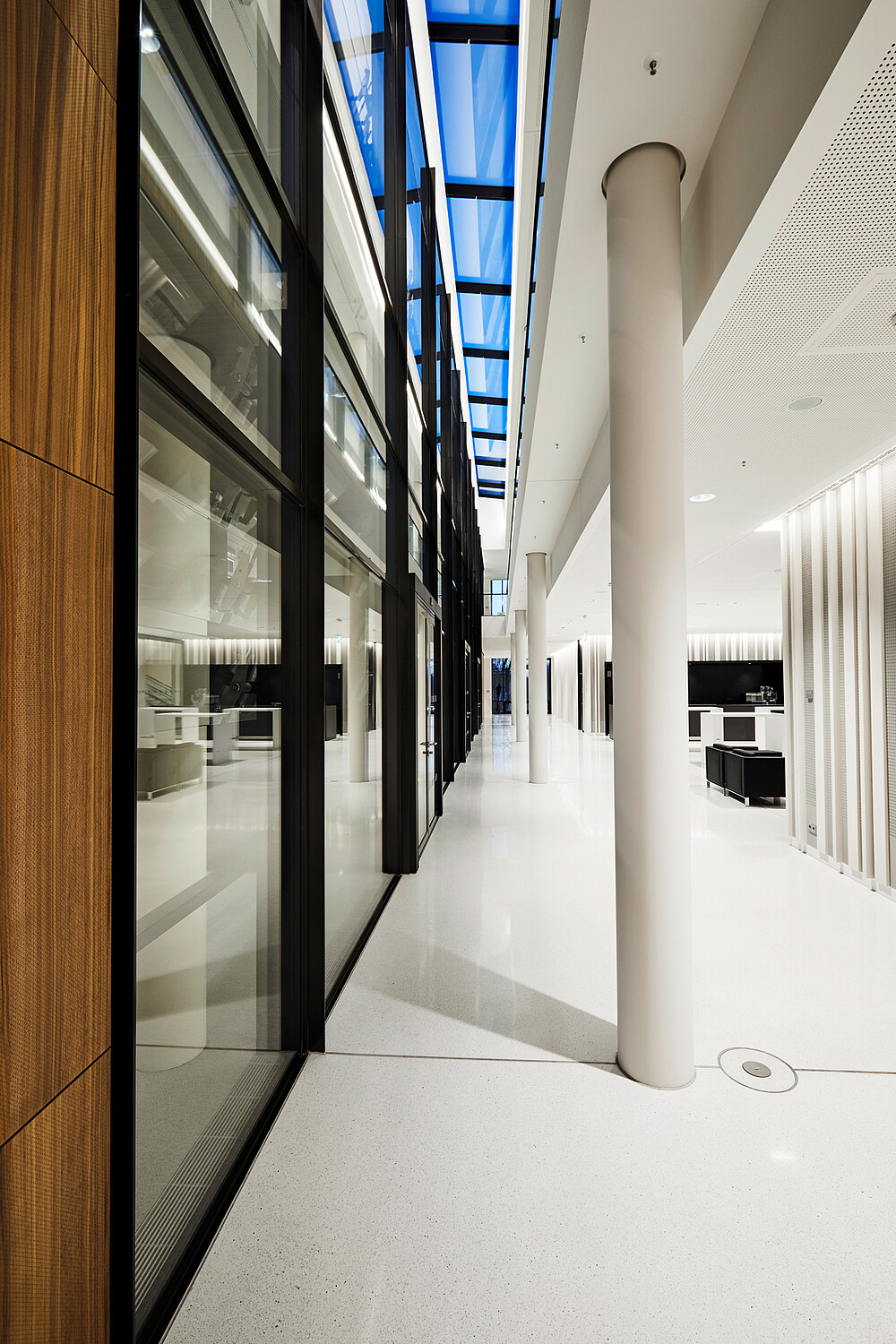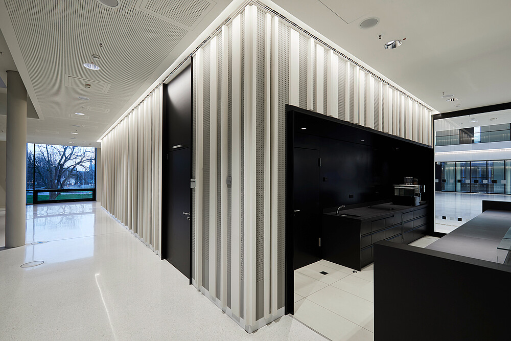 The light planners Licht Kunst Licht linked aesthetic aspects and functional requirements. Thus, the slightly oval ceiling dome is illuminated indirectly. A frame made of indirect light sets the roof space in the dark and gently fades in the glass surface. The indirect linear cove lighting on the different ceilings was realized with the LED Linear™ luminaire XOOLINE™ HD15 in 4,000 K, which ensures general lighting and sets accents for the different materials such as wood, concrete, metal.