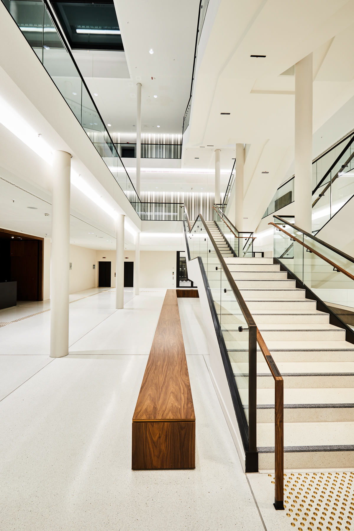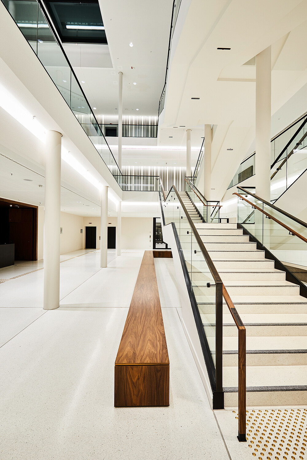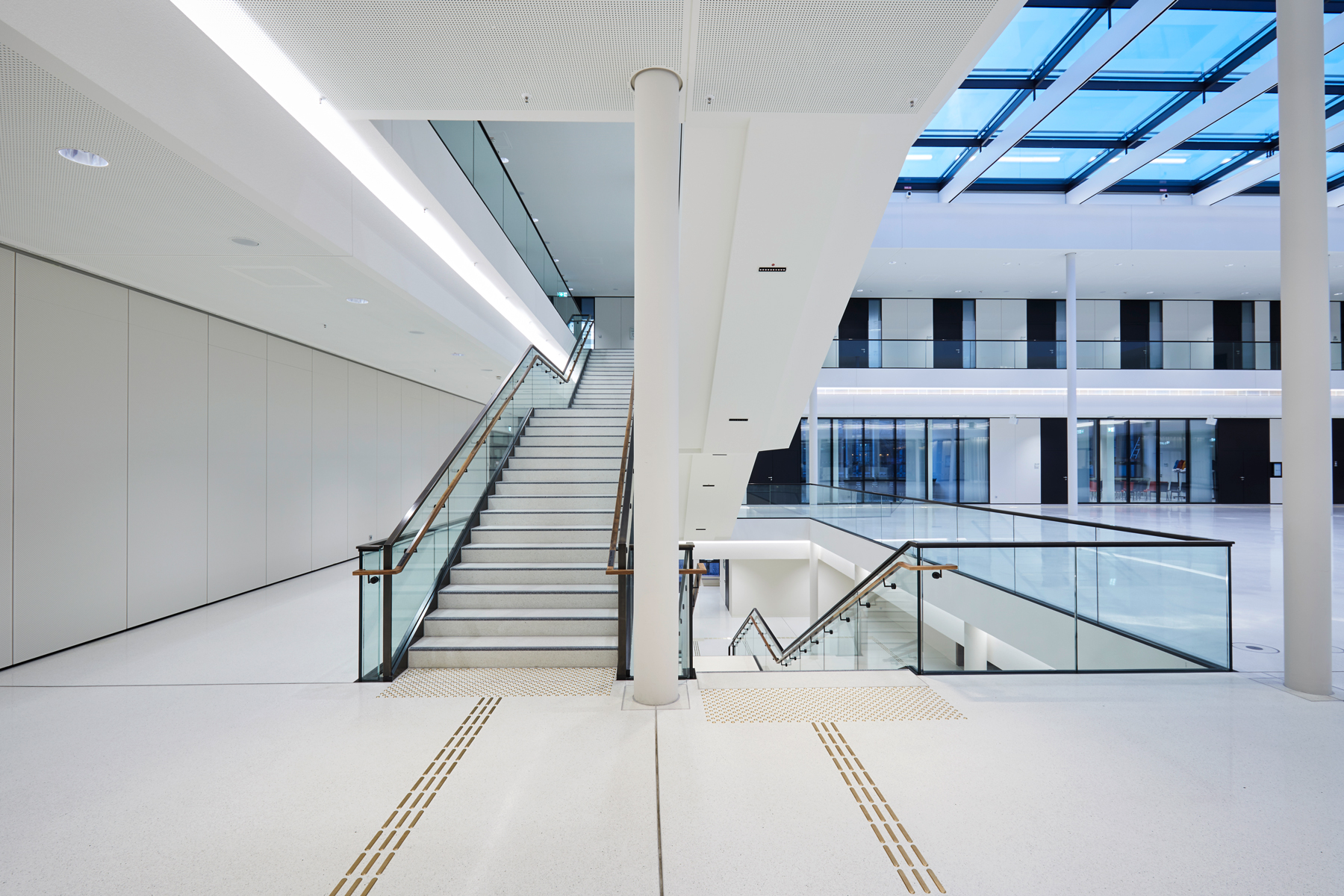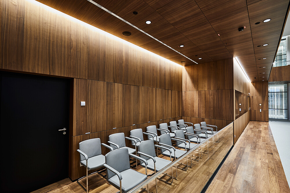 Light shapes the perception of space and creates atmosphere. Daylight is crucial for well-being. The plenary hall opens to the south over six façade-high windows to the square of the ‘Göttingen Sieben’ and is illuminated throughout the course of the year. Natural light develops its own character depending on the time of day. With complementary artificial light, consistent light conditions in daylight quality are achieved inside the hall, guaranteeing equally good working conditions, even on long days of meetings until the evening. A clearly structured lighting grid gives the plenary hall ceiling peace and continues into the ‘Portikushalle‘, the bistro and other secondary areas.